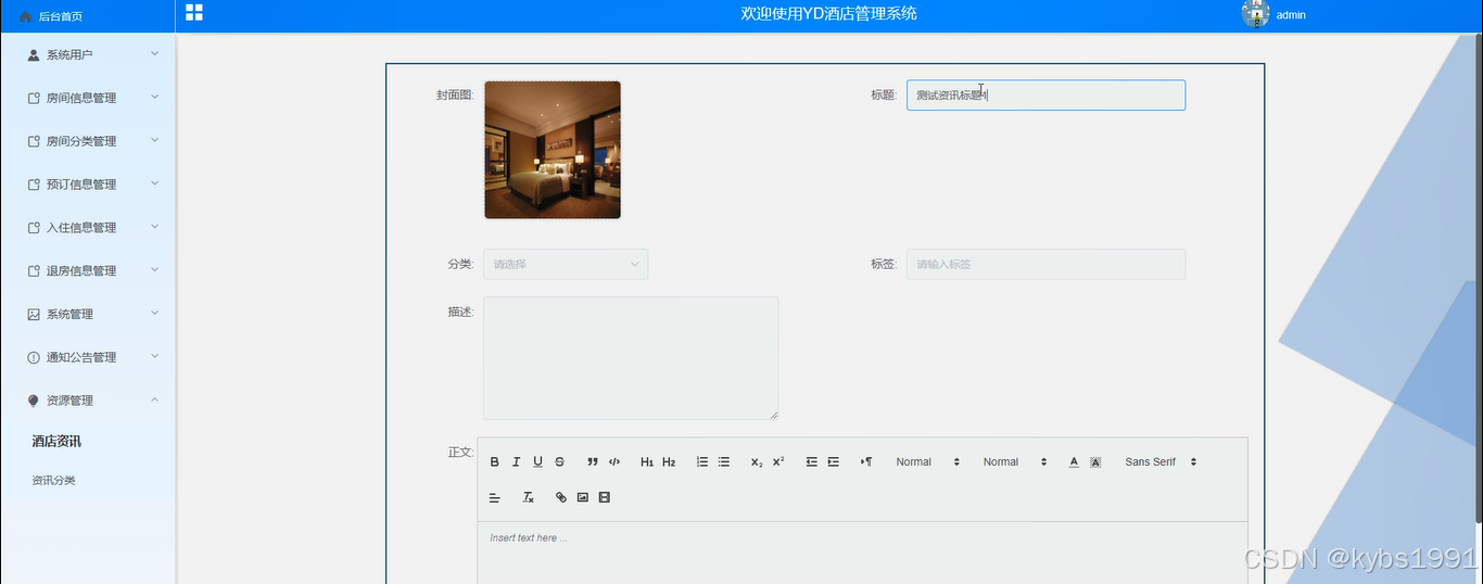 资源管理:管理员点击可查看酒店咨讯和咨讯分类;如需添加新的咨讯,上传封面图,输入标题,选择分类,输入标签、描述和正文,点击“提交”按钮进行添加。界面如下图所示。