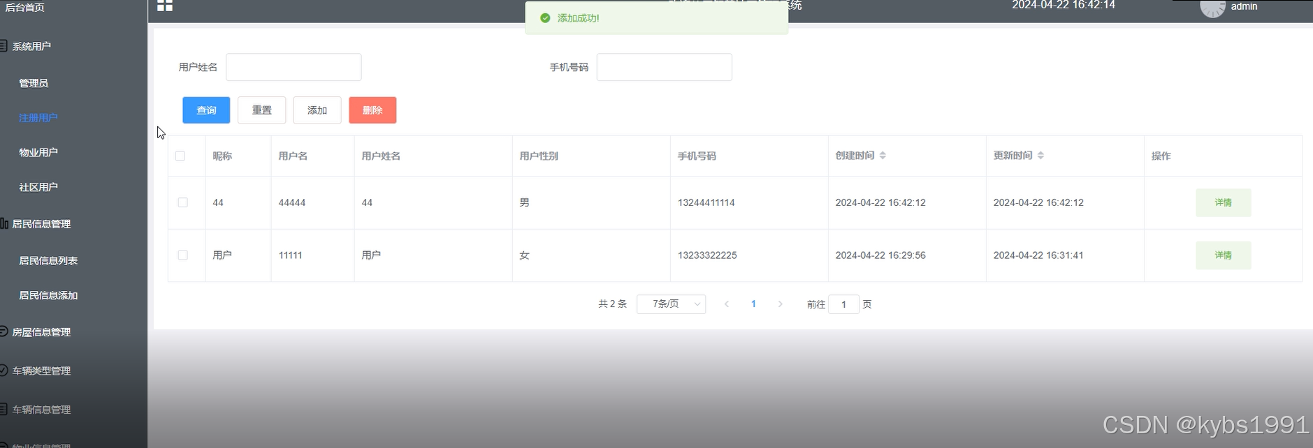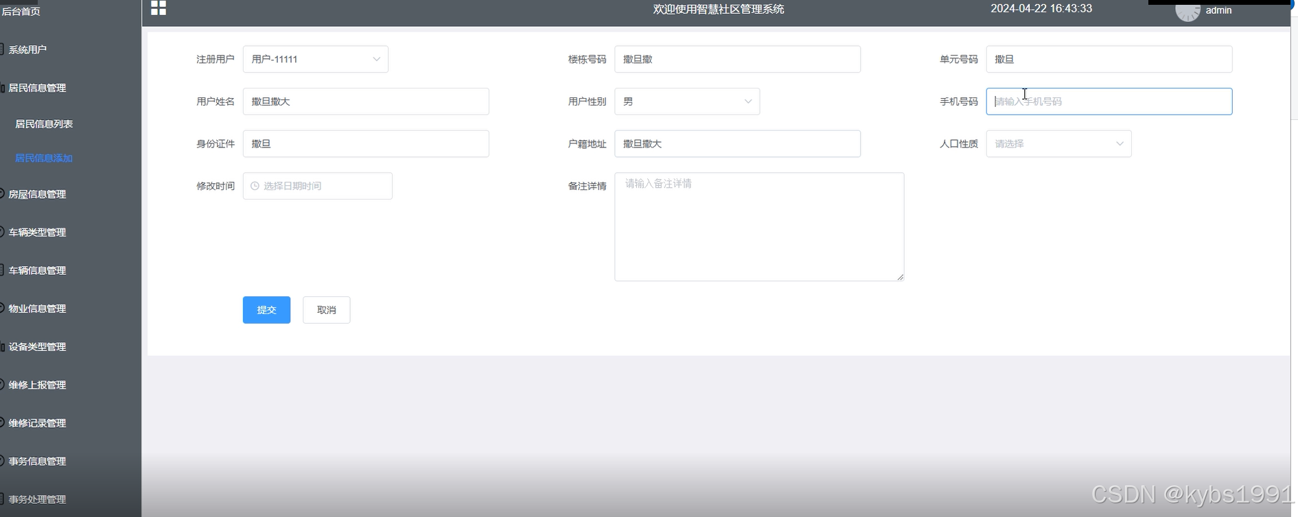 居民信息管理:管理社区居民的基本信息,包括姓名、联系方式、身份证号等。支持居民信息的录入、编辑、删除和查询操作。界面如下图所示。