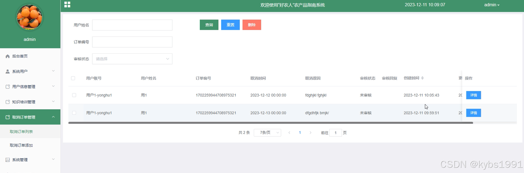 管理员在“好农人”农产品指南系统中执行取消订单管理,并具有相关操作权限,包括添加、查看、编辑和删除。通过点击“添加取消订单”,管理员可以进入取消订单添加界面,并填写详细信息。管理员可以点击字段级别链接来查看所选字段级别的相关信息。然后点击“提交”按钮返回到添加页面。成功添加的信息将显示在取消订单查询列表中,管理员可以对其进行编辑和修改操作。