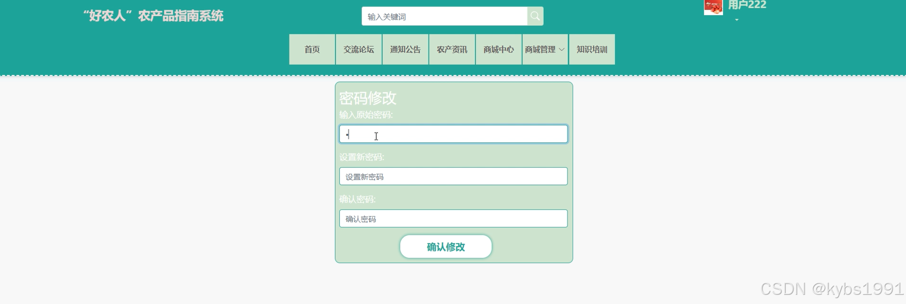 在“好农人”农产品指南系统中,用户注册完成后,如果用户需要修改登录密码,系统提供了相应的功能。所有操作者都有权限更改自己的密码信息。要执行此功能,首先必须登录系统,然后选择密码变更选项,在给定的文本框中填写初始密码和新密码来完成密码修改操作。在填写过程中,如果两次密码填写不一致,那么密码修改操作将失败。下面的图片展示了该功能所对应的工作界面。