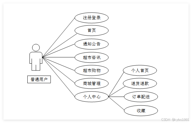 蔬菜水果销售系统前台用户的主要功能是对系统信息的查看、收藏、评论以及对超市商品的购买,购买的过程中需要对收货地址进行设置,对购物车进行管理,查看自己的订单。前台普通用户用例图如图2-8所示。