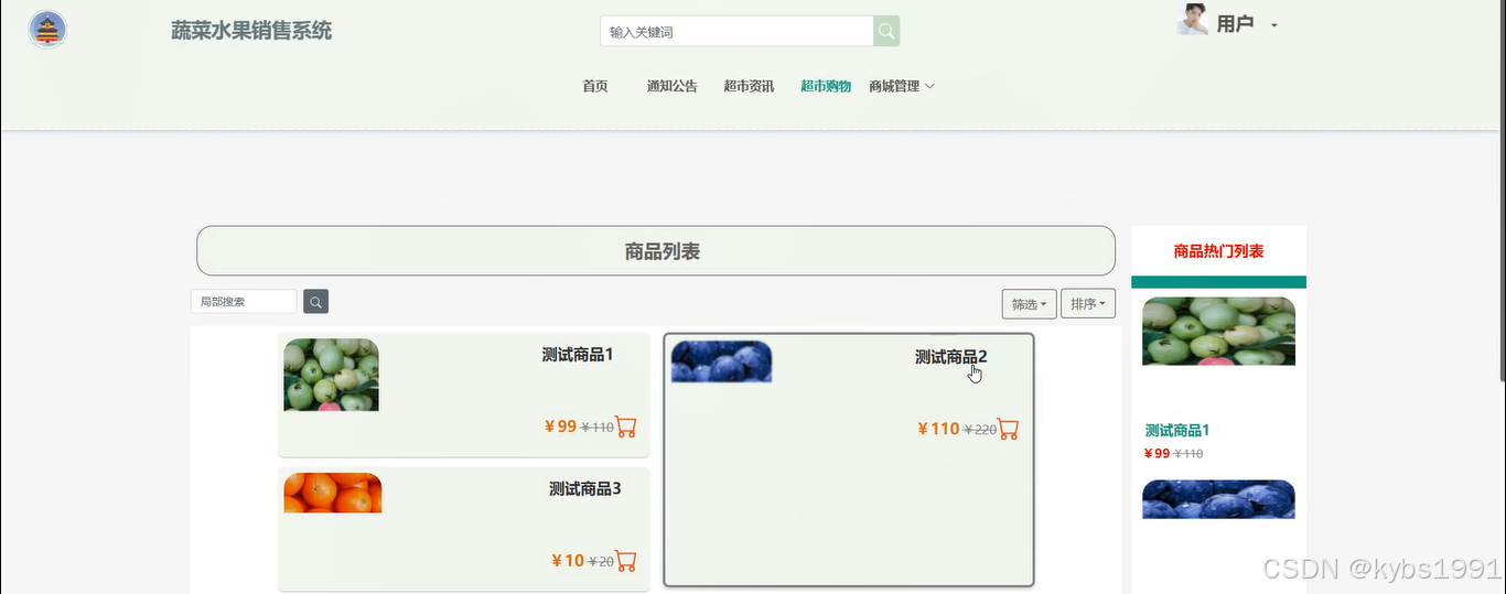 | 查询超市购物信息功能测试 | 查询成功的情况 | 用户在导航栏中点击“超市购物”,输入关键词查询商品,输入的超市购物在系统中存在,显示查询商品信息 | 查询成功 | 正确 |
