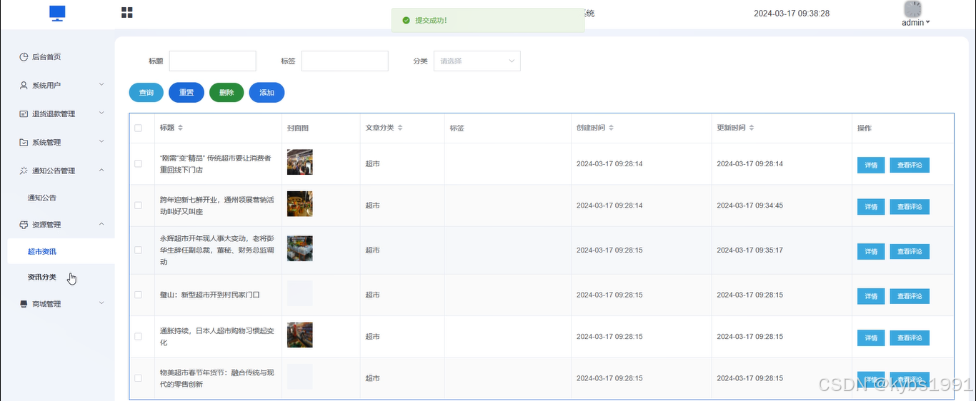 (7)资源管理:管理员点击可查看超市咨讯和咨讯分类;如需添加新的超市资讯,点击“新增”按钮,上传封面图,输入标题,选择分类,输入标签、描述和正文,点击“确认”按钮进行添加。同时可对咨讯进行增删改查。