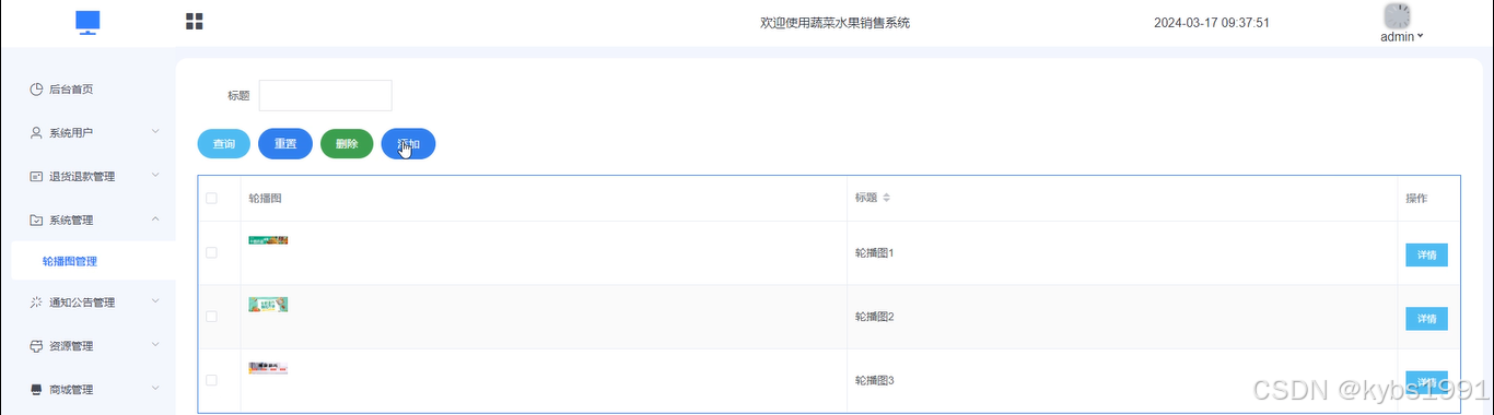 系统管理:当管理员点击“系统管理”时,可查看轮播图; 如需添加新的轮播图,点击右侧“添加”按钮,上传图片,输入标题,点击“确认”按钮进行添加;同时可对轮播图进行增删改查。界面如下图4-14所示。