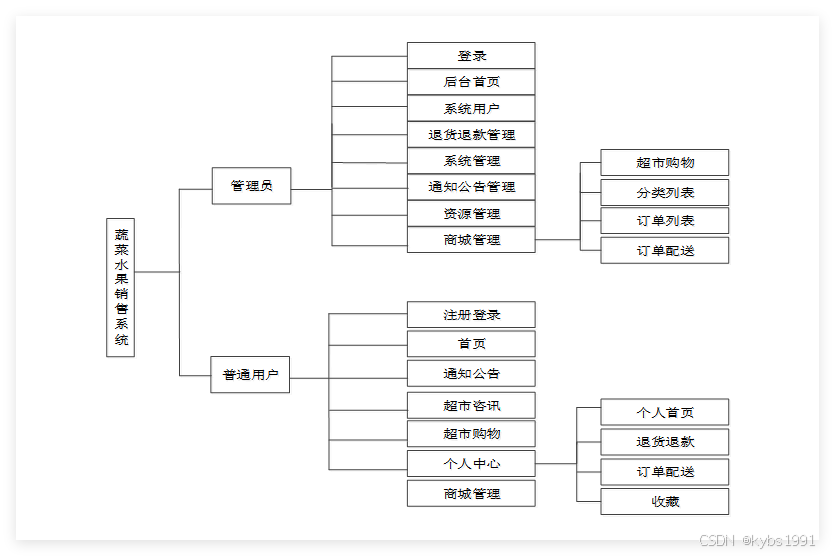 本蔬菜水果销售系统的设计主要是针对三种用户进行使用,第一种是以游客身份使用,游客在进入系统后可以查看到系统中的所有内容,包括首页、通知公告、超市购物、商城管理,如果想要购买下单,可以注册登录;第二种是注册之后有账号的用户,登录以后可以收藏、评论、购买、管理收货地址、订单、个人资料等;第三种则是管理员,是系统的管理者,管理员对系统中的商城公告、商品分类、用户提交的订单进行整体把控。