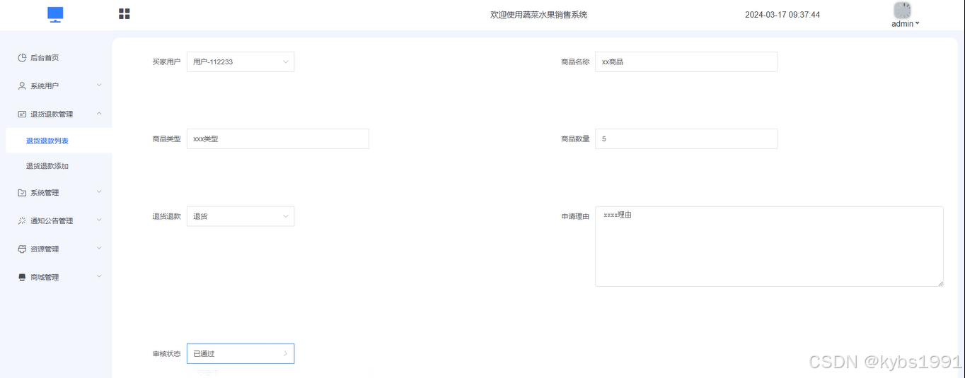 退货退款管理:管理员点击可查看退货退款列表,同时可对退款申请进行审核通过。界面如下图所示。