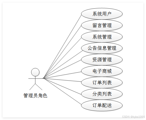 web后台管理上的管理员是维护整个空气净化器销售系统中所有数据信息的,管理员可以进行后台首页、系统用户(管理员、注册用户)、留言管理、系统管理、公告信息管理、资源管理(新闻列表、分类列表)、商城管理(订单列表、分类列表、电子商城、订单配送)。管理员角色用例如图2-2所示。