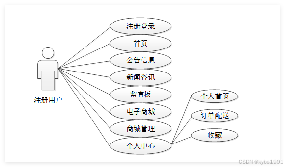 空气净化器销售系统的完整UML用例图分别是图2-1和图2-2。在参与者上包括用户以及管理员。前台上用户角色用例包括用户,其功能有注册登录、首页、公告信息、新闻咨讯、留言板、电子商城、商城管理等,注册用户角色用例如图2-1所示。