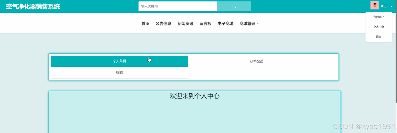 个人中心: 用户点击头像可查看“个人中心”,包括个人首页、订单配送和收藏。展示页面如图所示。