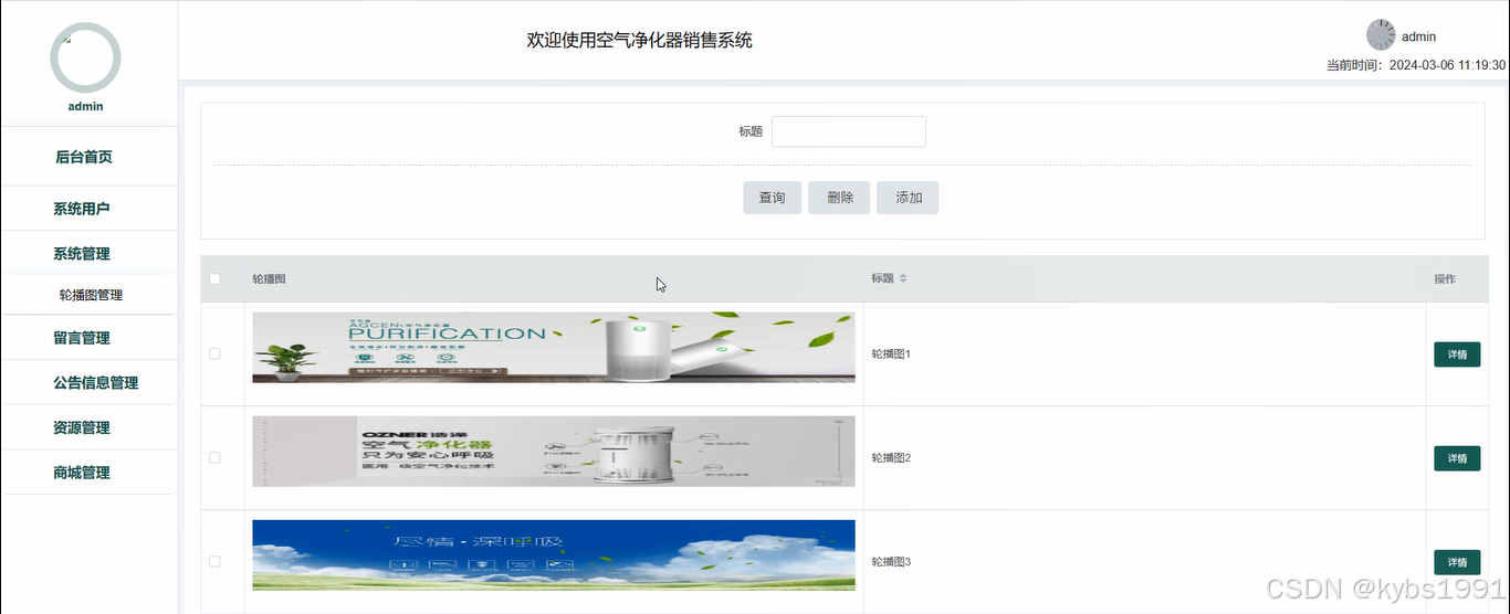 (4)系统管理:当管理员点击“系统管理”时,可查看轮播图; 如需添加新的轮播图,点击右侧“添加”按钮,上传图片,输入标题,点击“确认”按钮进行添加;同时可对轮播图进行增删改查。
