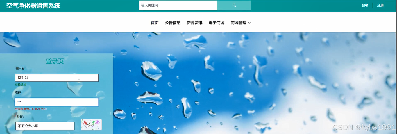 空气净化器销售系统中的前台上注册后的会员是可以通过自己的账户名和密码进行登录的,当会员输入完整的自己的账户名和密码信息并点击“登录”按钮后,将会首先验证输入的有没有空数据,再次验证输入的账户名+密码和数据库中当前保存的用户信息是否一致,只有在一致后将会登录成功并自动跳转到空气净化器销售系统的首页中;否则将会提示相应错误信息,用户登录界面如下图4-3所示。