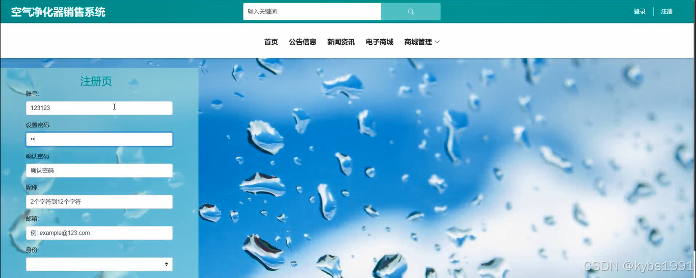 不是空气净化器销售系统中正式用户的是可以在线进行注册的,当填写上自己的账号+设置密码+确认密码+昵称+邮箱+身份+姓名等信息,再点击“注册”按钮后将会先验证输入的有没有空数据,再次验证密码和确认密码是否是一样的,最后验证输入的账户名和数据库表中已经注册的账户名是否重复,只有都验证没问题后即可注册成功。用户注册界面展示如下图4-2所示。
