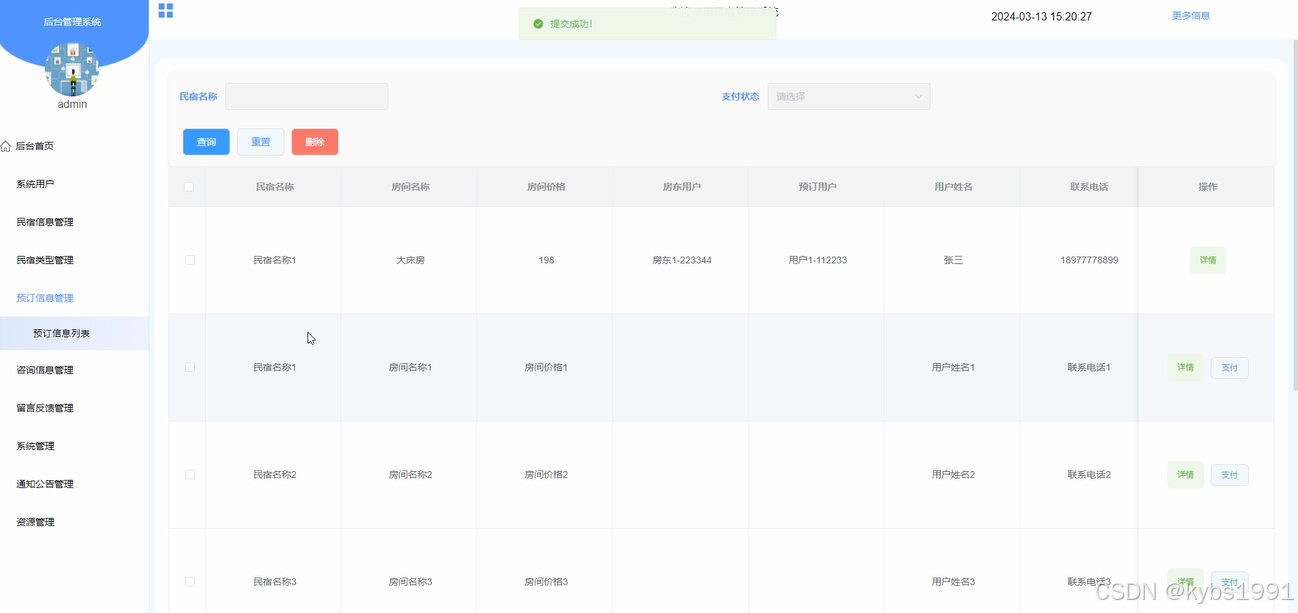 (7)预订信息:管理员点击“预订信息列表”会显示出所有的预订信息,支持输入民宿名称对预订信息进行查询,可以选择某一条预订信息,点击“删除”进行删除,也可以点击后面的“支付”按钮对预订信息的支付信息进行设置;