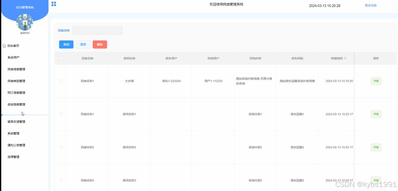 管理员点击“咨询信息”会显示出所有的咨询信息,支持输入民宿名称或者房间名称对咨询信息进行查询,也可以选择某一条咨询信息,点击“删除”进行删除。界面如下图4-11所示。