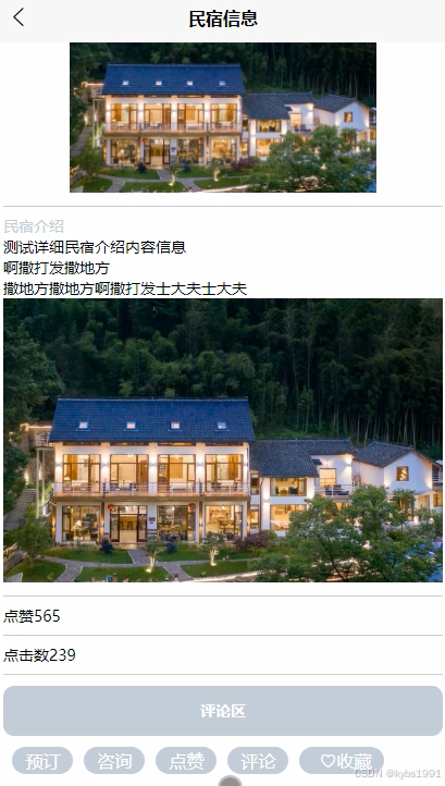 (5)民宿信息:用户可以查看民宿信息推荐信息,在查询到自己想要了解的民宿信息的时候,可以进入查看详细的介绍,点击“预订”这一按钮以后会跳转到预订信息填写的界面,根据提示填写好预订的信息,点击“提交”以后预订就完成了;点击“咨询”这一按钮以后会跳转到咨询信息填写的界面,根据提示填写好咨询的信息,点击“提交”以后咨询就完成了在民宿信息详情这个界面,同时支持用户对喜欢的民宿进行收藏、点赞以及评论的功能。