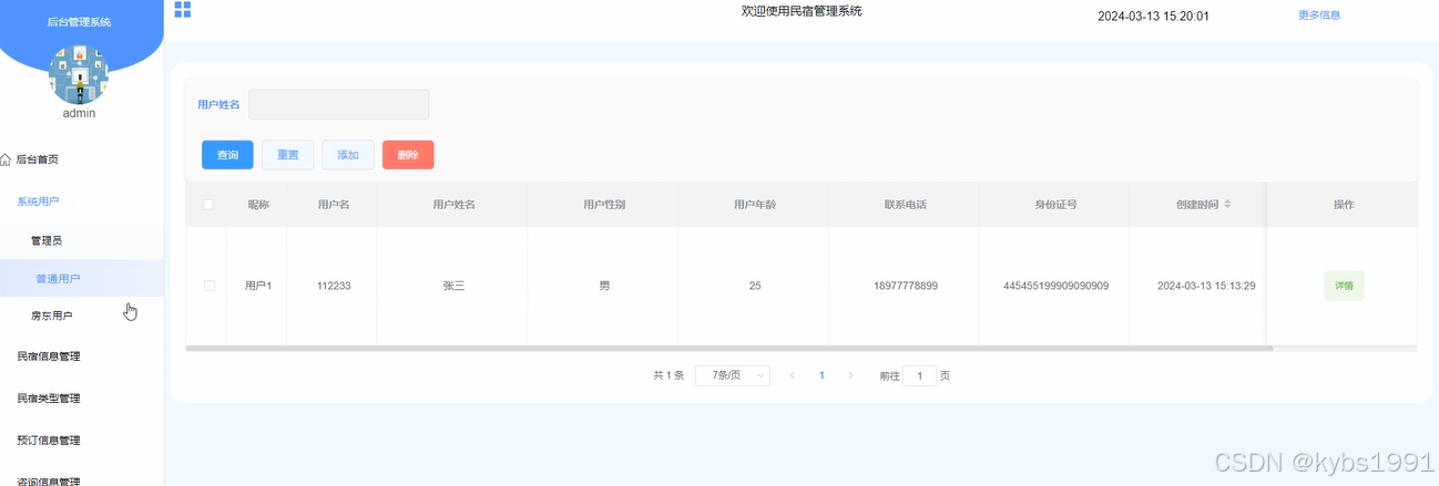 民宿管理系统APP中的管理人员在“系统用户”这一菜单是中可以对注册的普通用户、房东以及管理员进行管控。界面如下图4-8所示。