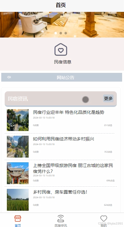 (2)查看民宿管理系统APP的首页信息:民宿管理系统APP的首页信息包含了首页、通知公告、民宿资讯、民宿信息等。