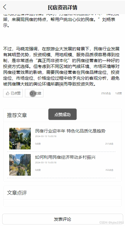 (4)民宿资讯:当用户点击“民宿资讯”这一菜单按钮,会显示管理员在后台发布的所有的民宿资讯,可以查看详情,进行收藏、点赞、评论等;