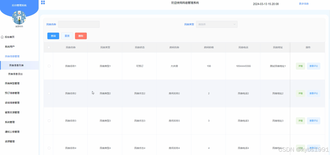 管理员点击“民宿信息”会显示出所有的民宿信息,支持选择民宿名称或者民宿类型对民宿信息进行查询,如果想要添加新的民宿信息,点击“添加”按钮,输入相关信息,点击“提交”按钮就可以添加了,同时可以选择某一条民宿信息,点击“删除”进行删除,也可以对用户提交的民宿信息评论的信息进行管控。界面如下图4-9所示。
