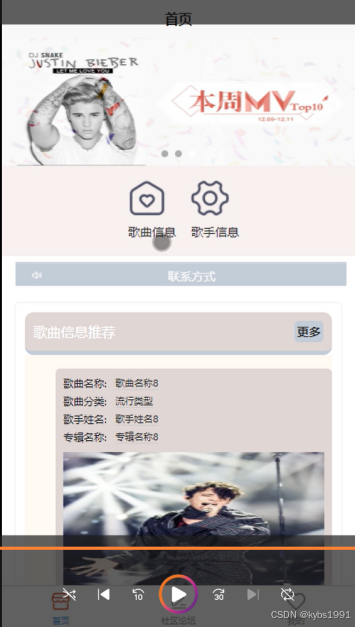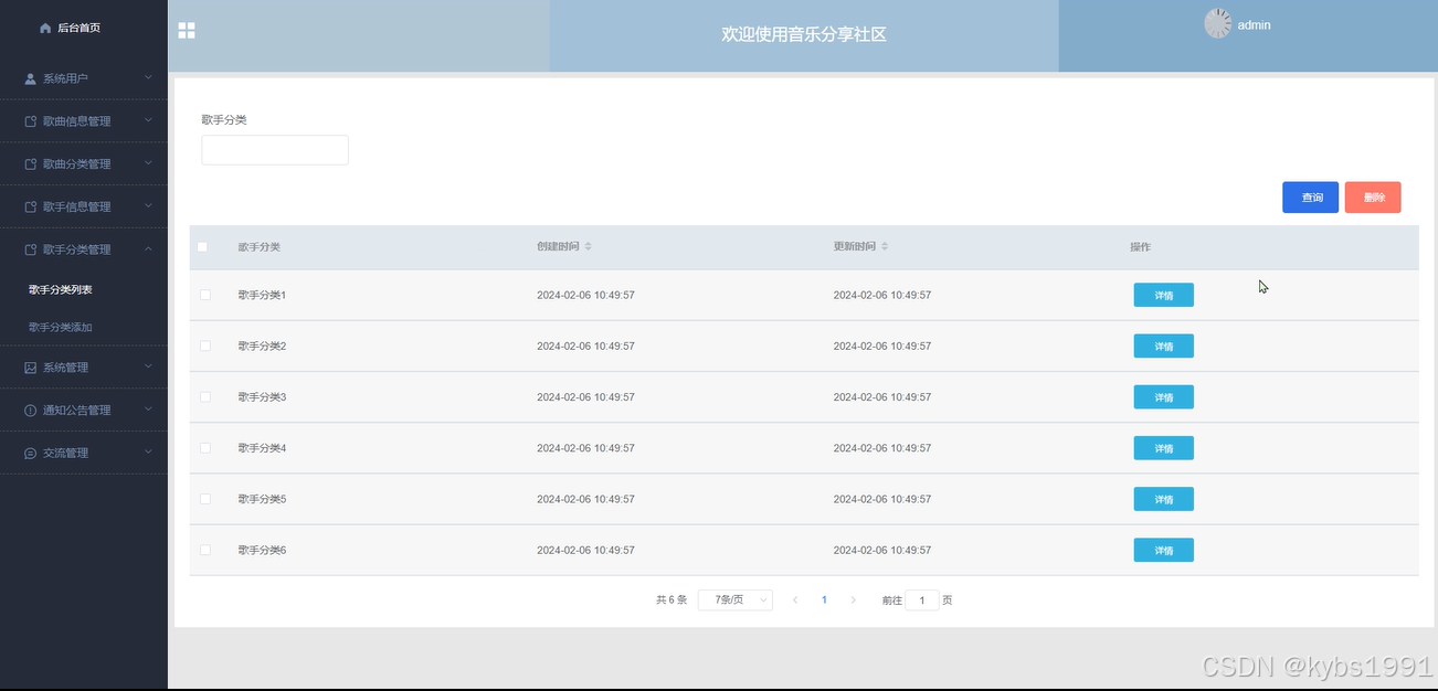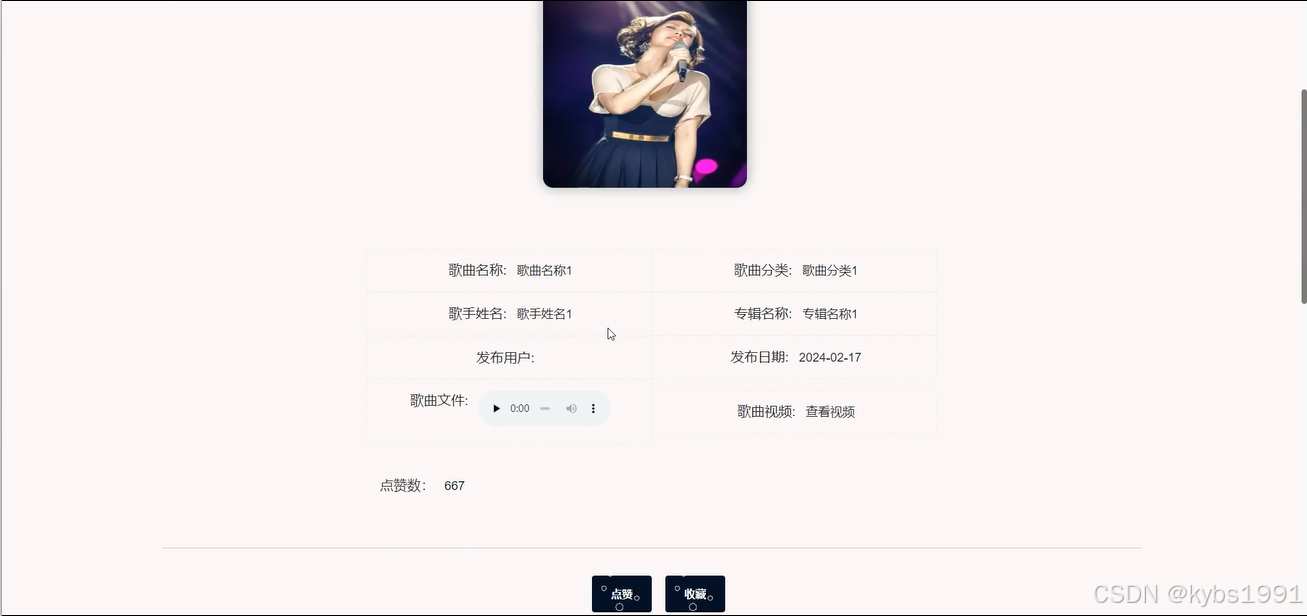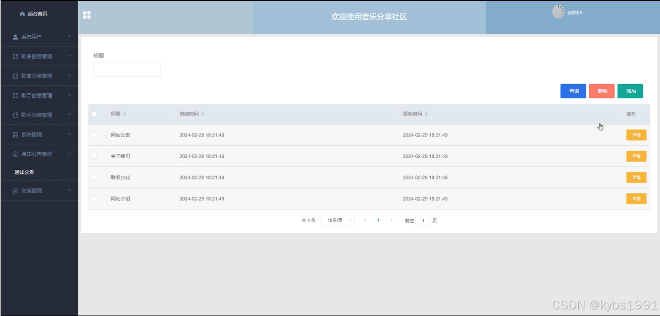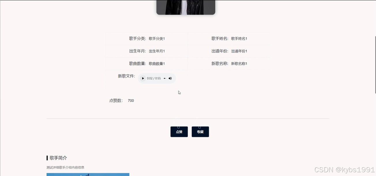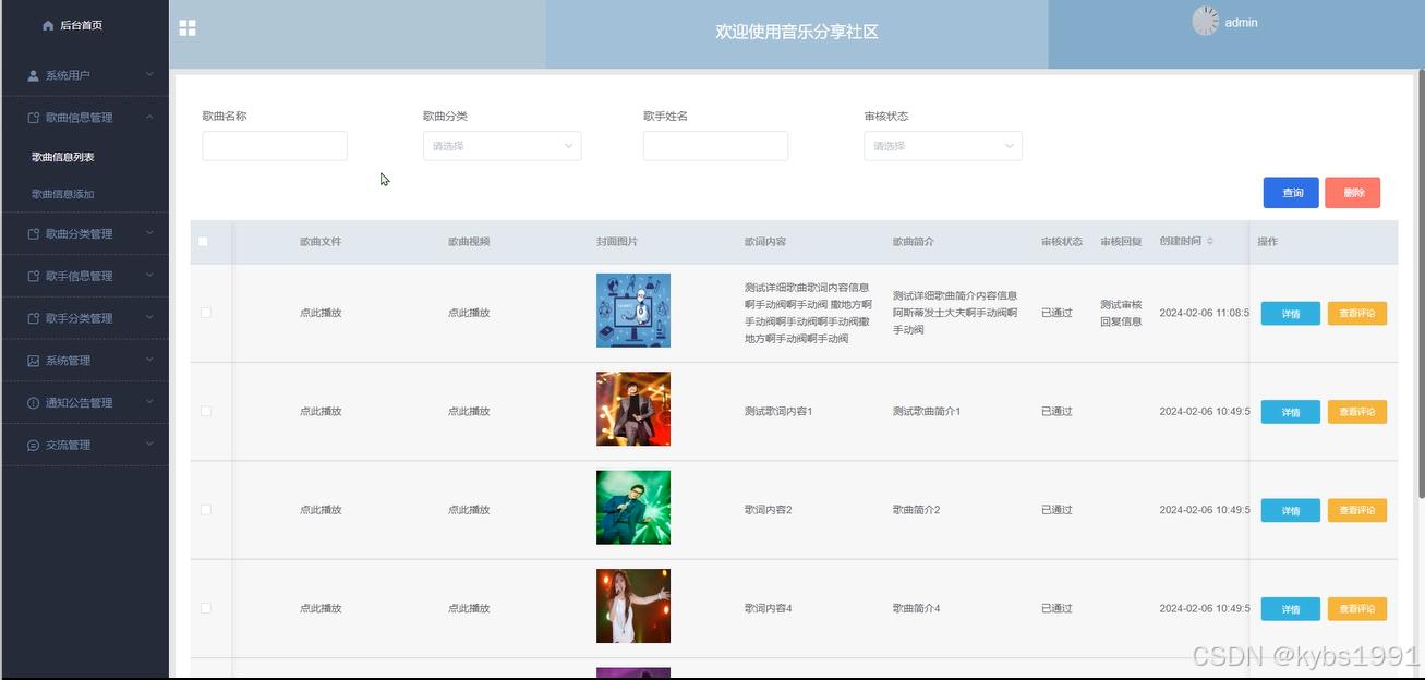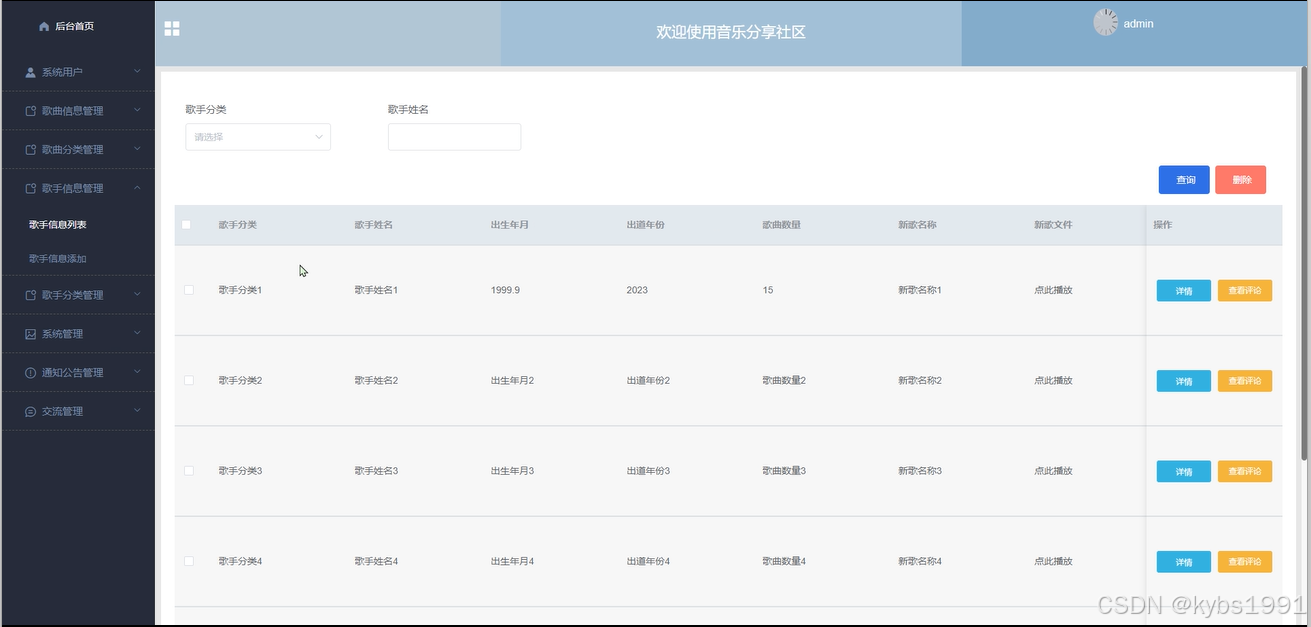 歌手信息管理,管理员在歌手信息列表对某一条信息进行详情查看,和评论回复,在歌手信息添加输入歌手分类、歌手姓名、出生年月、出道年份、歌曲数量、新歌名称、新歌文件等信息内容进行提交添加、并且根据需要进行添加、修改或删除操作,如图4-17所示。