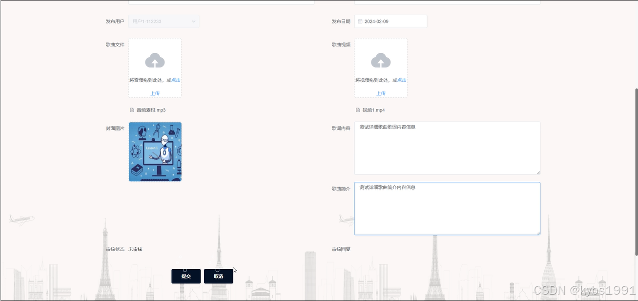 歌曲信息管理,管理员在歌曲信息列表可查看系统中所有的歌曲详情信息和用户的评论信息并进行管控,在歌曲信息添加页面可编辑歌曲文件、歌曲视频、封面图片、歌词内容、歌曲简介等信息进行完成歌曲信息的添加操作并进行审核,如图4-15所示。