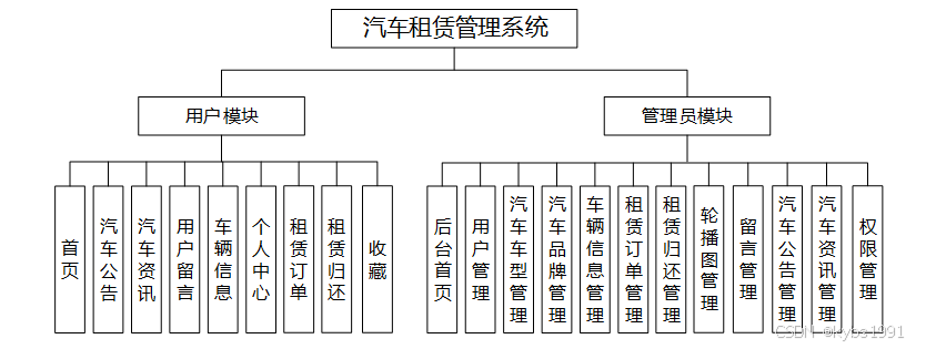 通过上一章节的功能需求分析,可以得出本汽车租赁管理系统的功能结构图,图3.1就是系统的功能模块图。