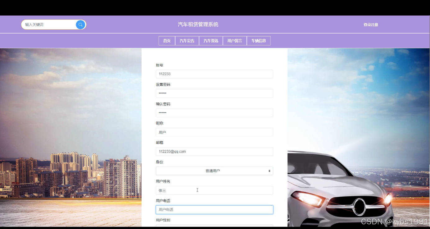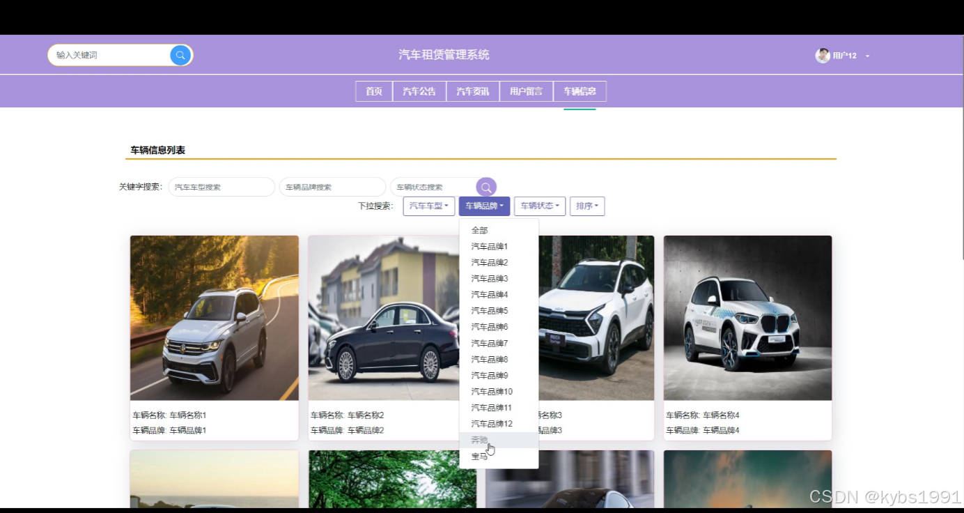 - 首页:用户可以浏览最新的汽车公告、汽车资讯和推荐汽车信息,并快速进入租赁页面。