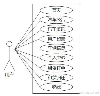 汽车租赁管理系统中用户角色功能包含了首页、汽车公告、汽车资讯、用户留言、车辆信息、个人中心、租赁订单、租赁归还、收藏等功能,用户的用例图如图2.1所示: