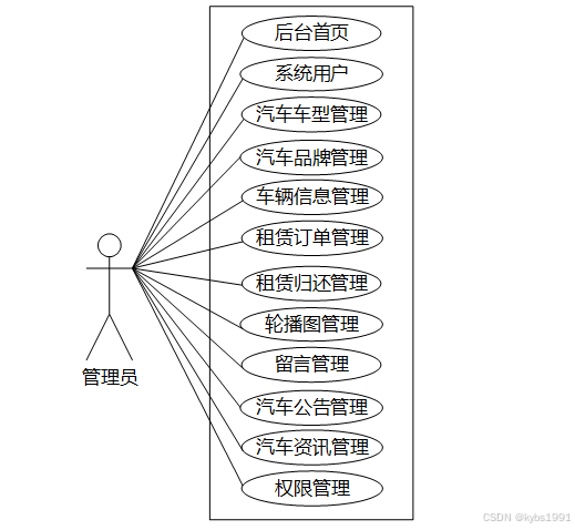 汽车租赁管理系统中管理员角色功能包含了后台首页、系统用户(普通用户、员工用户、管理员)、汽车车型管理、汽车品牌管理、车辆信息管理、租赁订单管理、租赁归还管理、轮播图管理、留言管理、汽车公告管理、汽车资讯管理、权限管理等功能,管理员的用例图如图2.2所示: