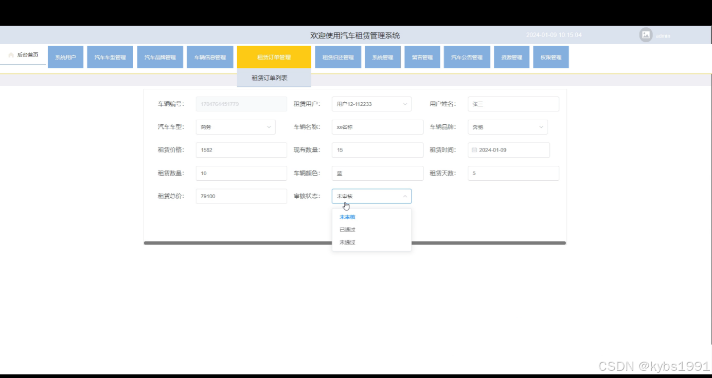 - 租赁订单管理:管理员可以查看和管理用户的租赁订单,查询订单详情、包括车辆编号、租赁用户、用户姓名、车型、名称、品牌、租赁价格、现有数量、租赁时间、租赁数量、车辆颜色、租赁天数、租赁总价等信息,管理员还可以修改订单状态等。