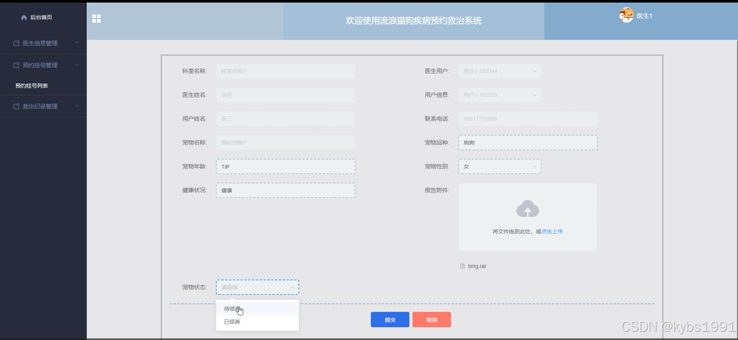 关键词:流浪猫狗疾病预约救治系统,Springboot框架,MySQL数据库
