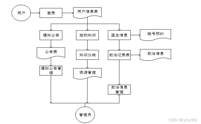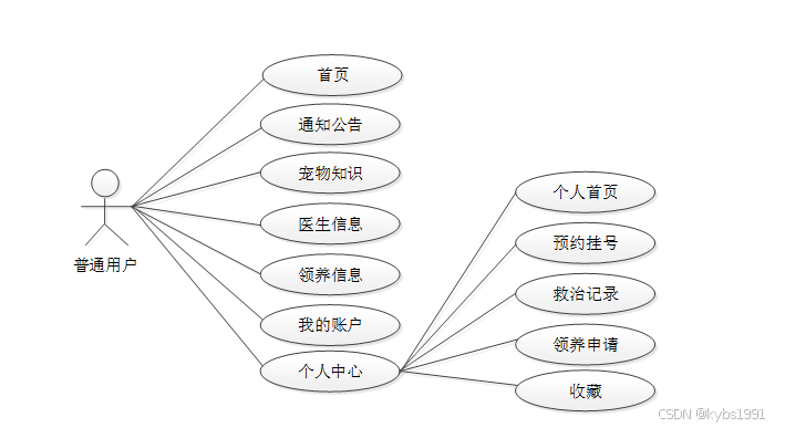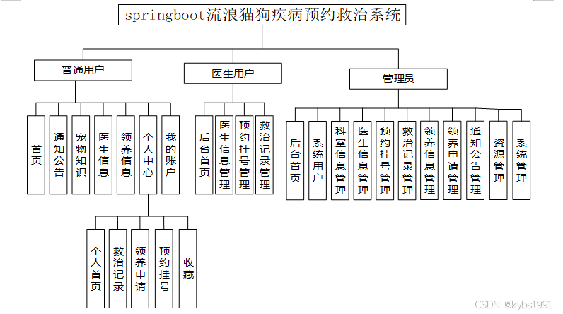 流浪猫狗疾病预约救治系统主要是为了更加地完善,对科室信息、医生信息、领养信息、救治记录等提供了方便的机制。本系统有多类使用者,分别是普通用户、医生、管理员。以下是从这三种用户的角度分别介绍本系统所要实现的功能。