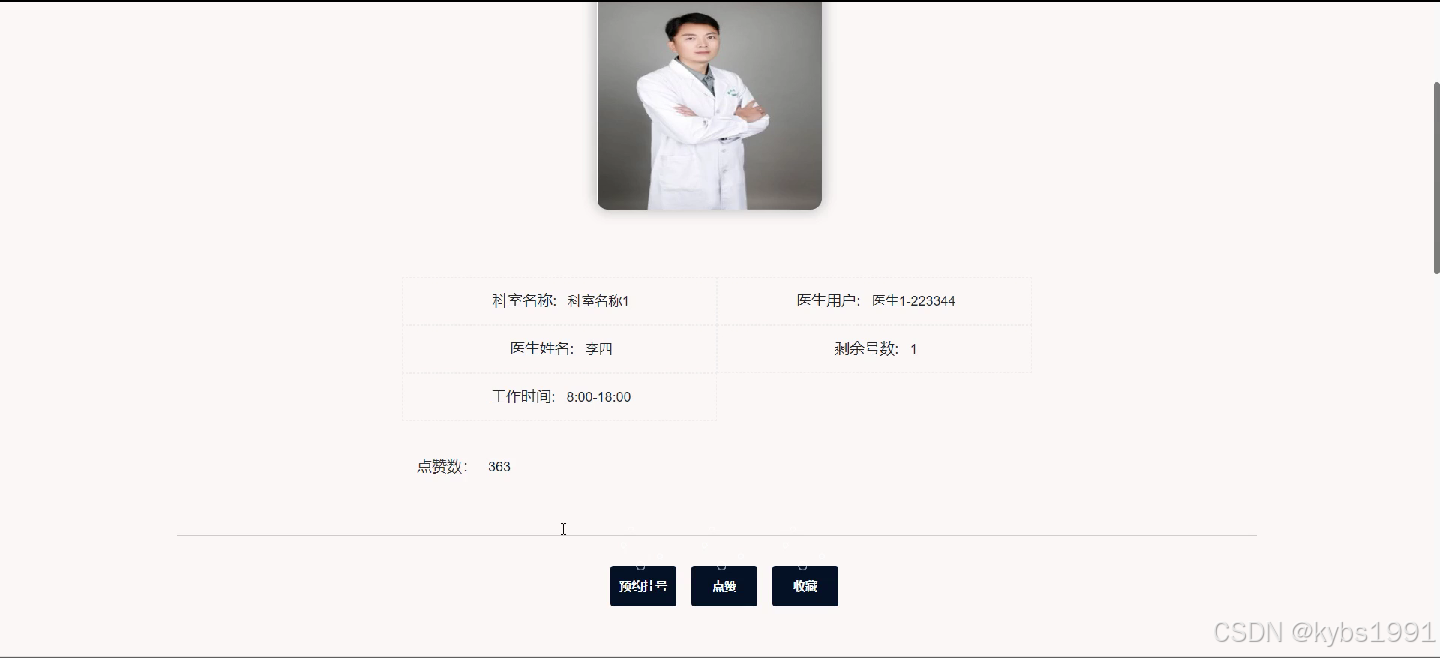 - 医生信息:前台用户可以查看医生的基本信息和专业资质,了解医生详情和就诊时间,还可以通过预约挂号系统进行医生的线上预约,方便用户就诊。