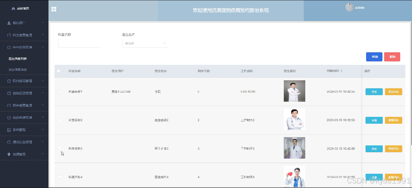 - 医生信息管理: 管理员可以在后台管理医生的基本信息,包括工作时间、医生照片、医生介绍等,还可以进行医生排班管理、权限分配和医生信息的审核与更新。