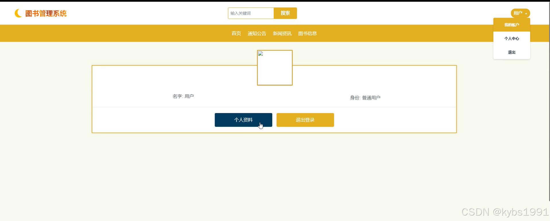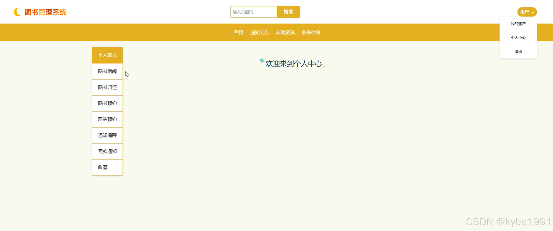 (7)个人中心:当用户点击“个人中心”时,我们会看到个人首页、图书借阅、图书归还、图书预约、取消预约、通知提醒、罚款通知、收藏,用户可以对其进行操作。