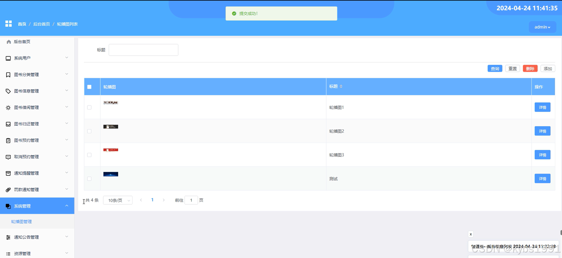 (11)系统管理:管理员点击“系统管理”菜单,可以查看到所有的轮播图信息,并可对轮播图信息进行增删改查。