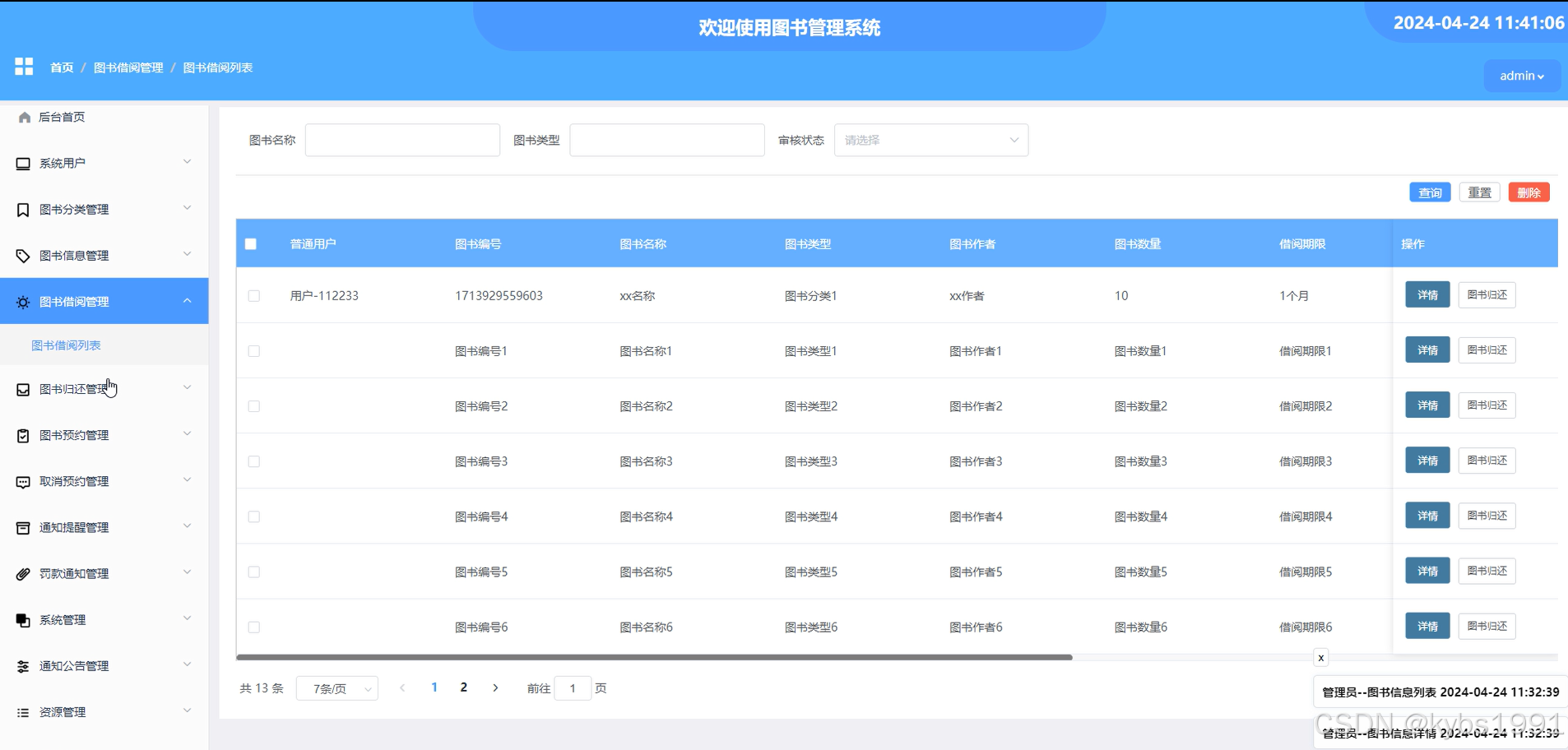 (5)图书借阅管理:管理员点击“图书借阅管理”菜单,可以查看到所有的图书借阅信息,并可对图书借阅信息进行增删改查和借阅审核以及查看归还情况。