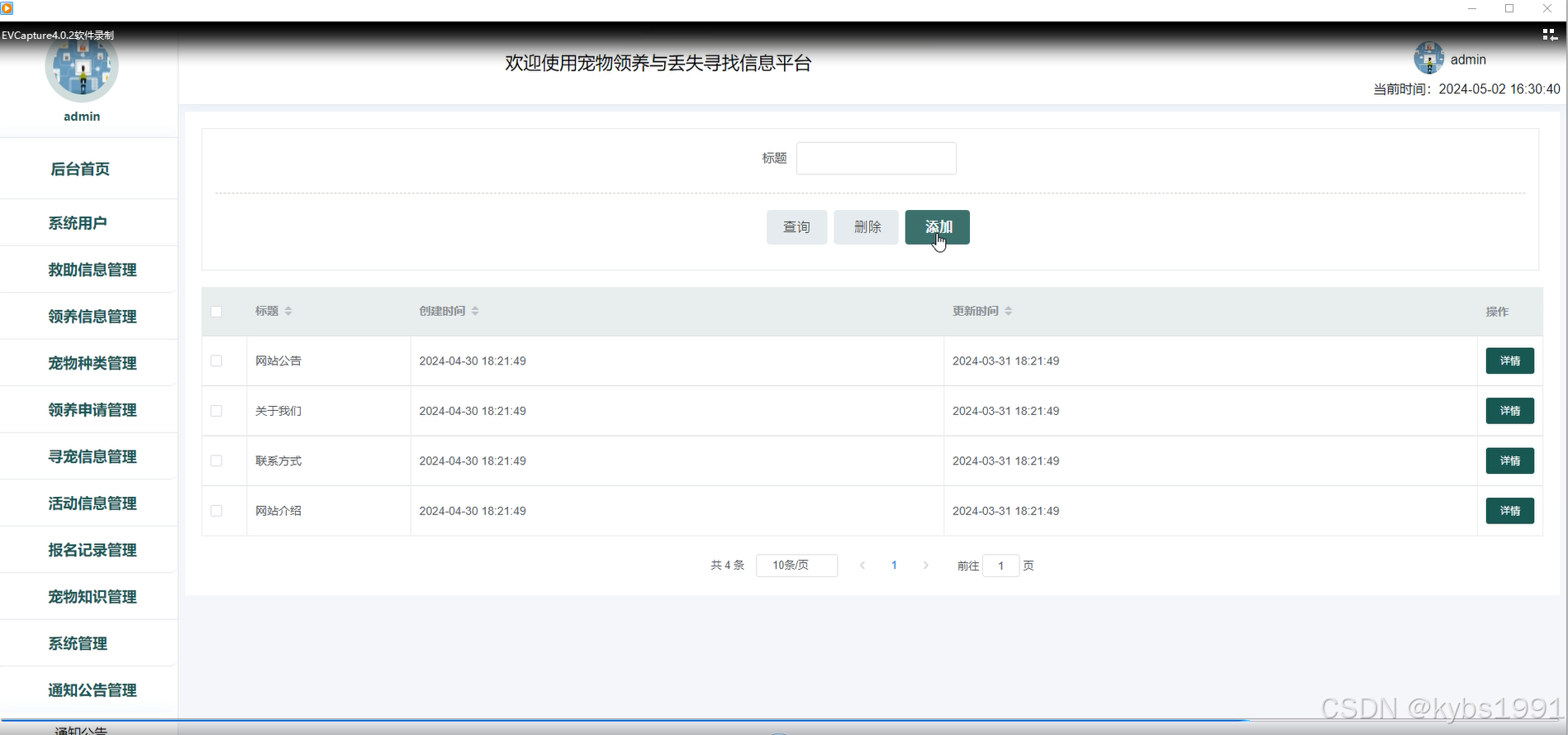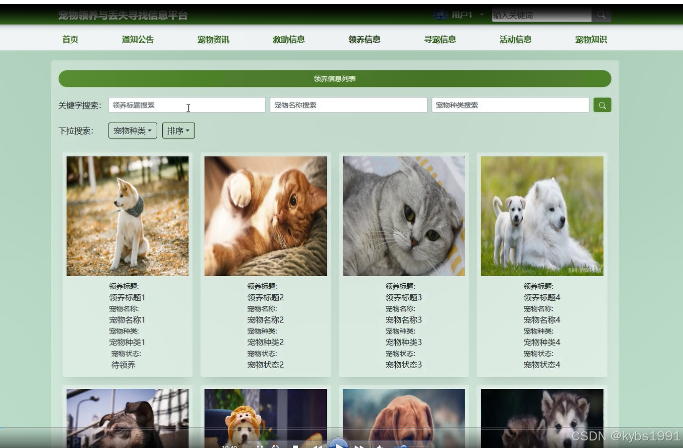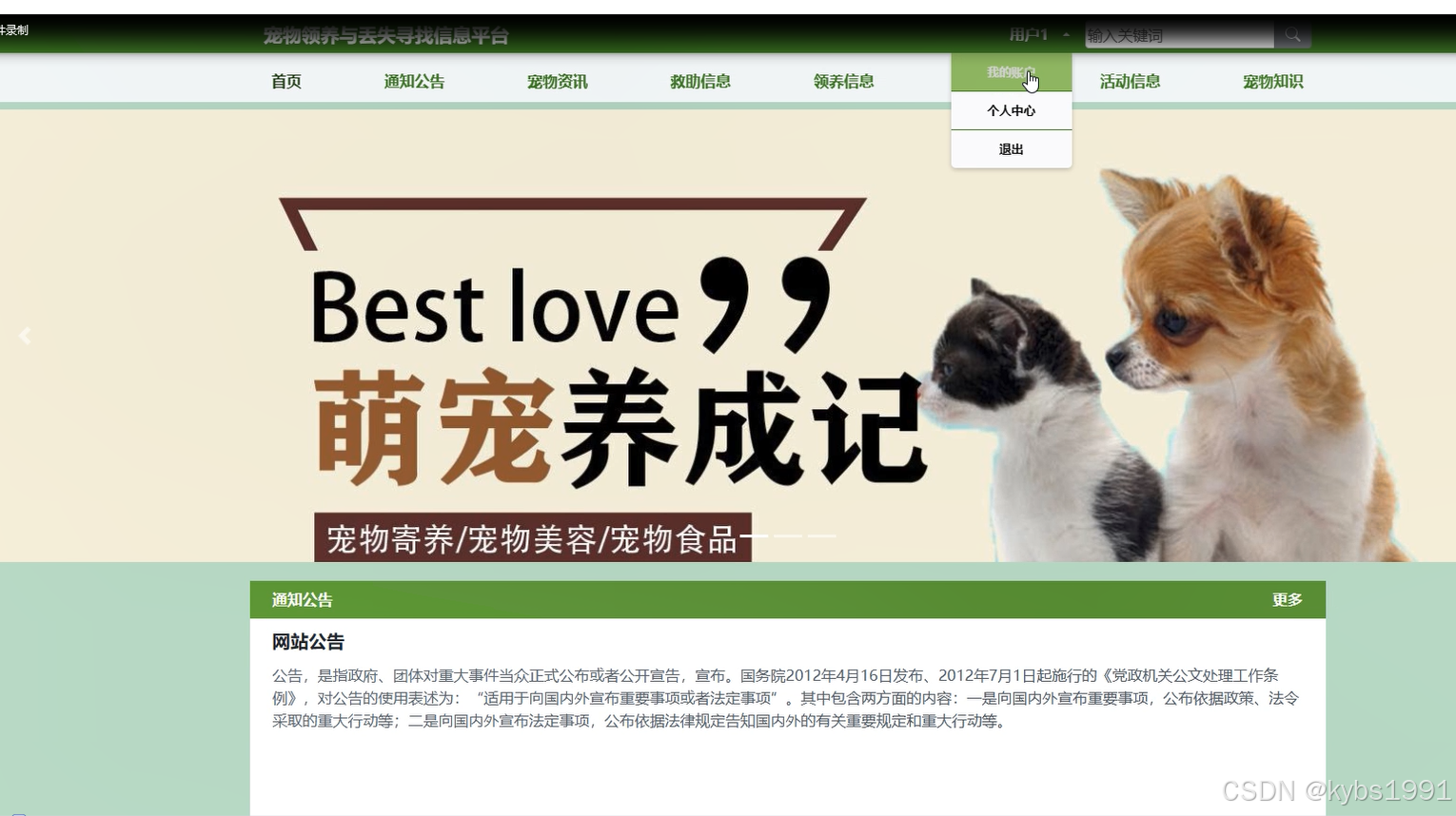 第四章对宠物领养与丢失寻找信息平台进行实现,并贴出相关页面截图,语言描述出具体功能实现的操作方法。