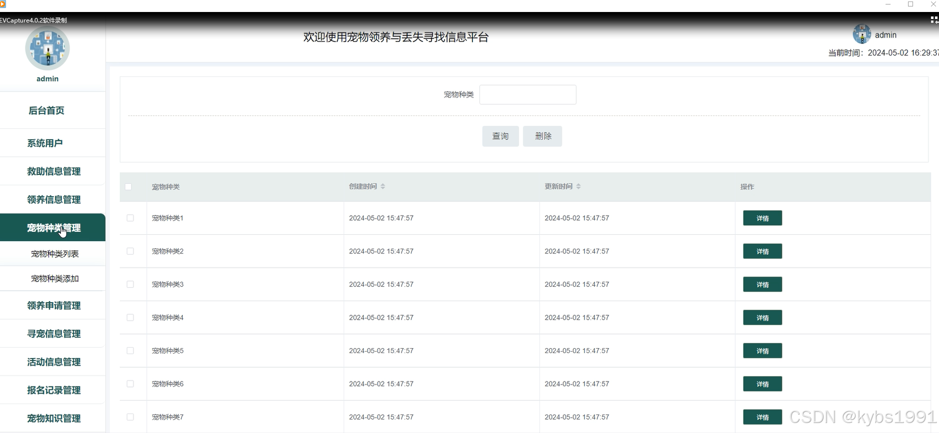 管理员可以管理宠物种类信息,包括添加、编辑、删除宠物种类,确保平台上展示的宠物种类信息的准确性和完整性。宠物种类管理界面如下图所示。