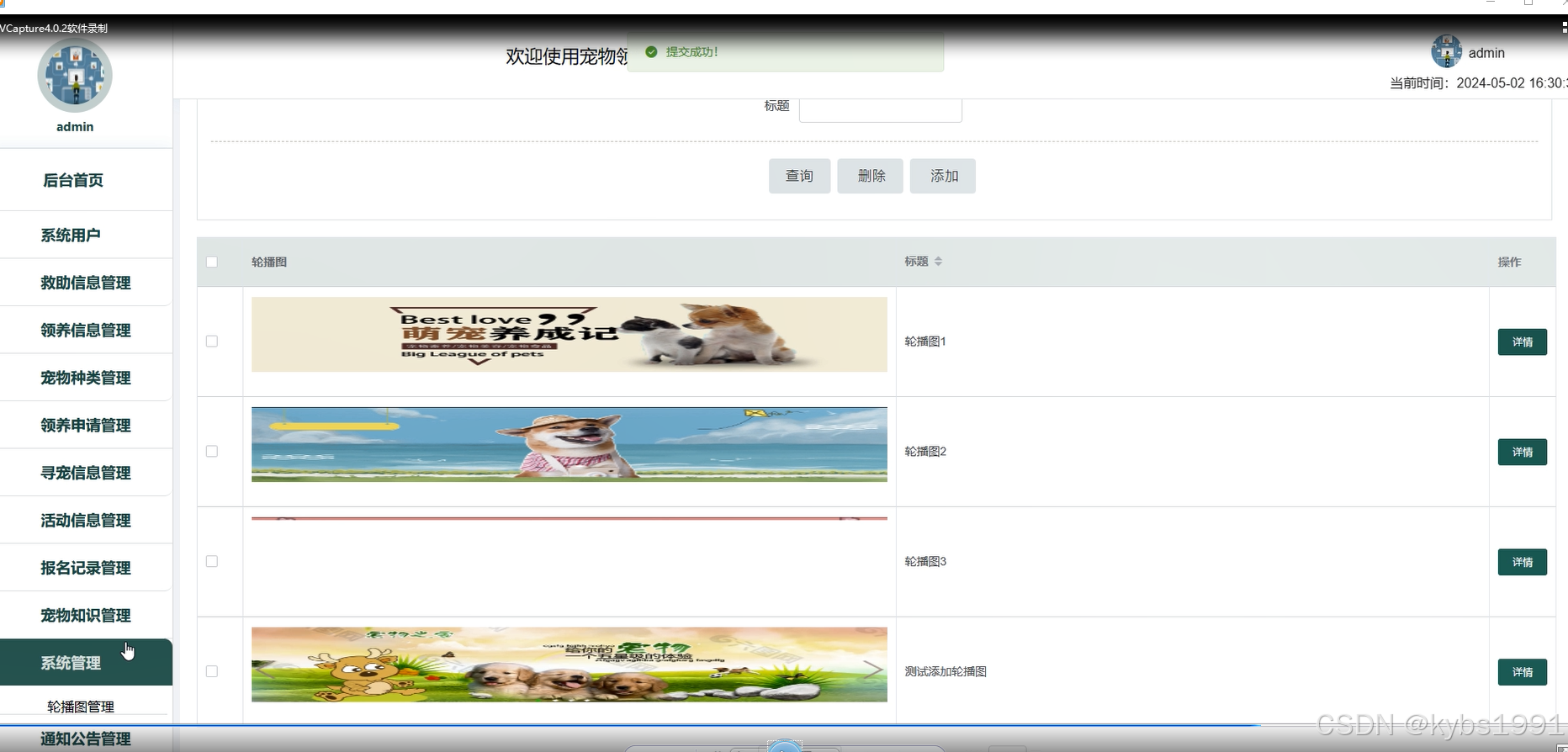 管理员可以对系统前台展示的轮播图进行增删改查,方便用户进行查看。系统管理界面如下图所示。