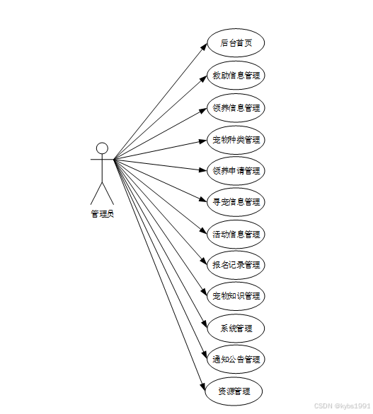 管理员角色的用例包括后台首页、系统用户、救助信息管理、领养信息管理、宠物种类管理、领养申请管理、寻宠信息管理、活动信息管理、报名记录管理、宠物知识管理、系统管理、通知公告管理、资源管理。