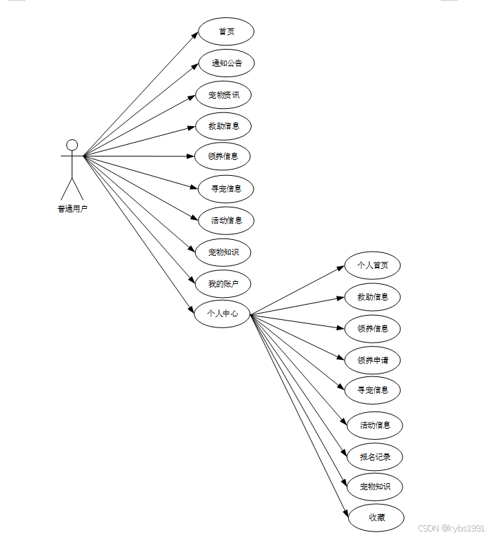 普通用户角色的用例包括首页、通知公告、宠物资讯、救助信息、领养信息、寻宠信息、活动信息、宠物知识、我的账户、个人中心(个人首页、救助信息、领养信息、领养申请、寻宠信息、活动信息、报名记录、宠物知识、收藏)。