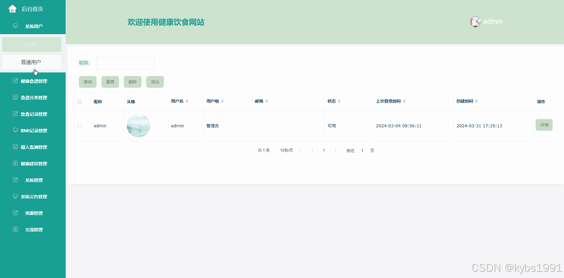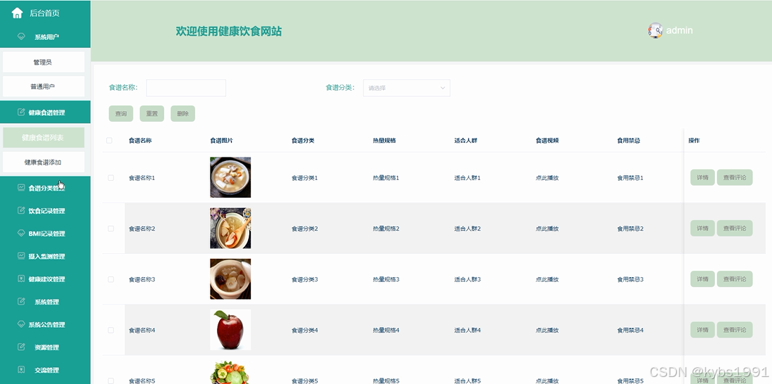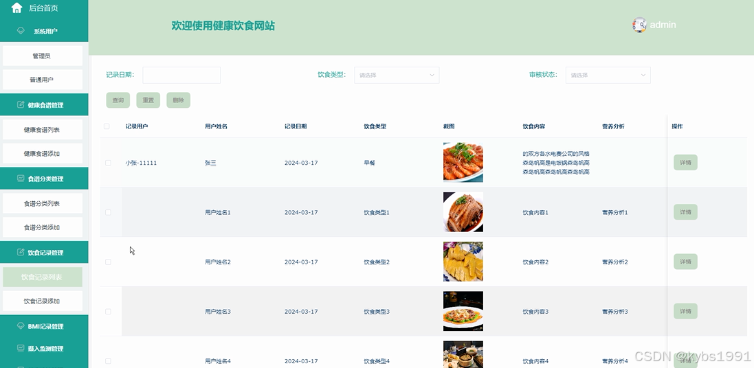 健康食谱管理:管理员可以对健康食谱管理信息进行添加,可以查看健康食谱管理列表中的某一信息详情,可以对健康食谱管理列表进行查询和删除等操作。