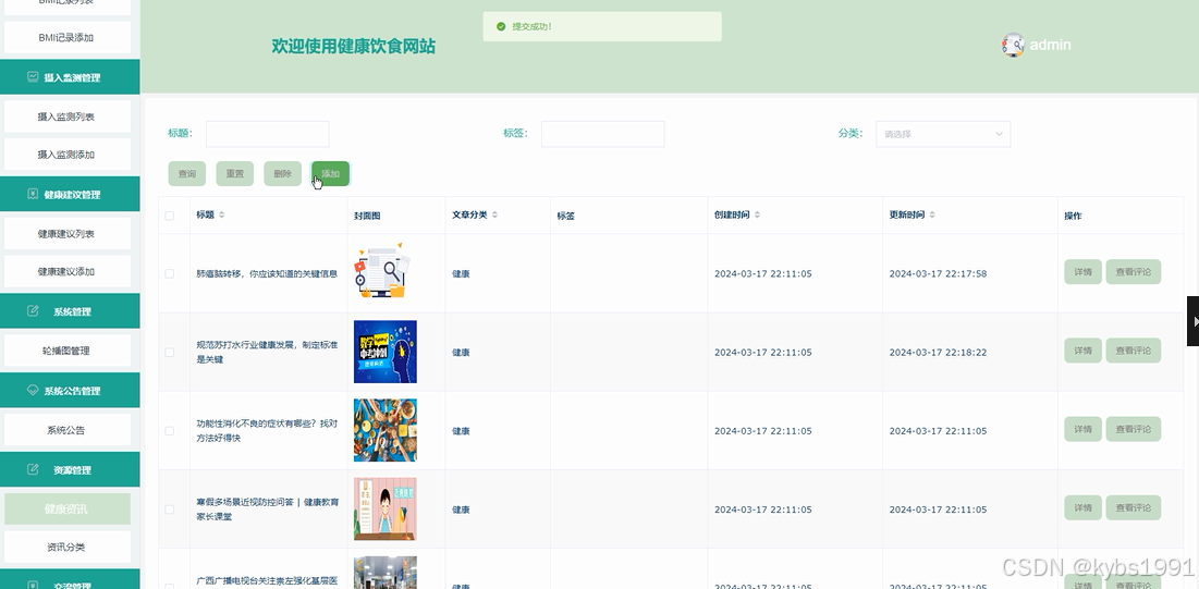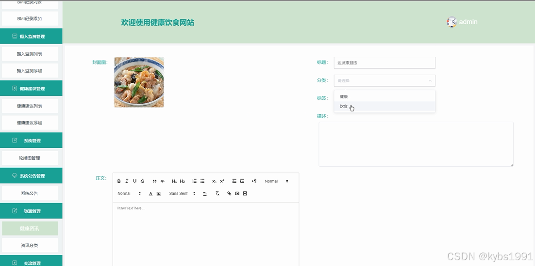 资源管理:资源管理包括健康资讯和资讯分类两部分,管理员可以在健康资讯模块对饮食相关资讯进行管理,包括添加资讯、修改资讯信息、删除资讯等操作;在资讯分类模块可以对资讯进行分类管理,方便用户浏览和查询。