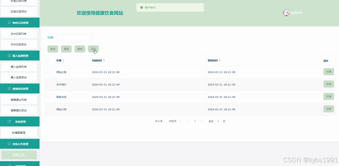 系统公告:用户可以在系统公告模块查看健康饮食网站查看的系统公告,包括网站公