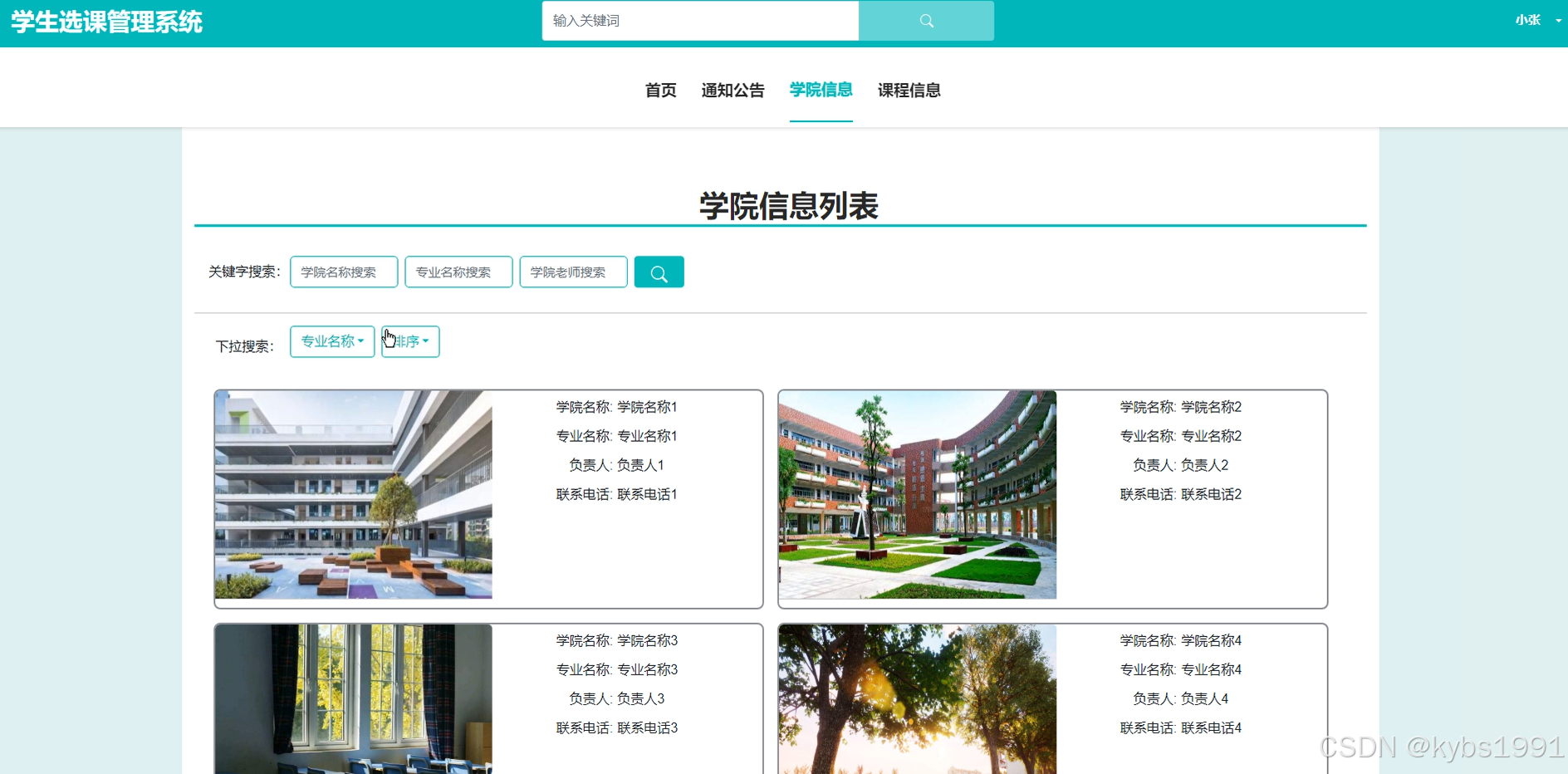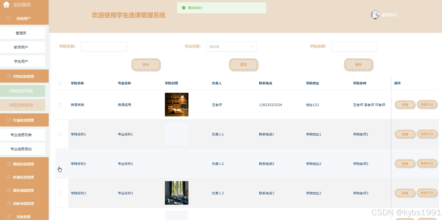 学院信息管理:可以查看学院信息的学院名称、专业名称、学院封面、联系电话、负责人等信息。可以进行查询、删除、添加等操作,如下图所示。