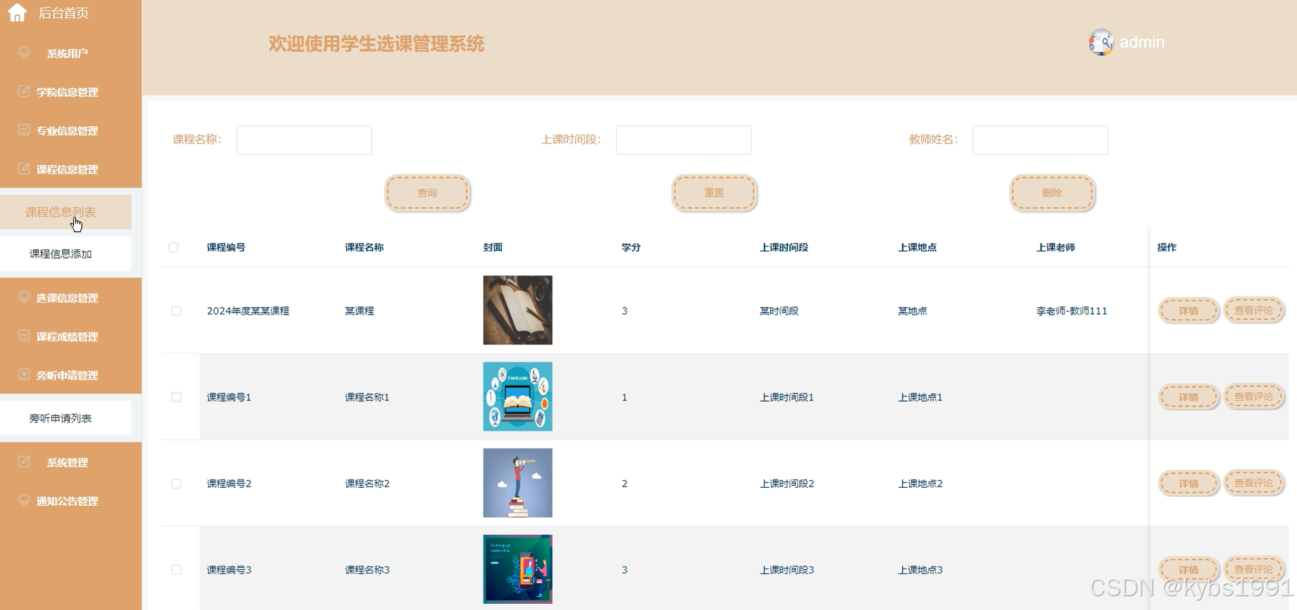 课程信息管理:可以查看课程编号、封面、学分、上课时间段、上课地点、开班人数等信息,可以进行查询、删除、添加等操作,如下图所示。