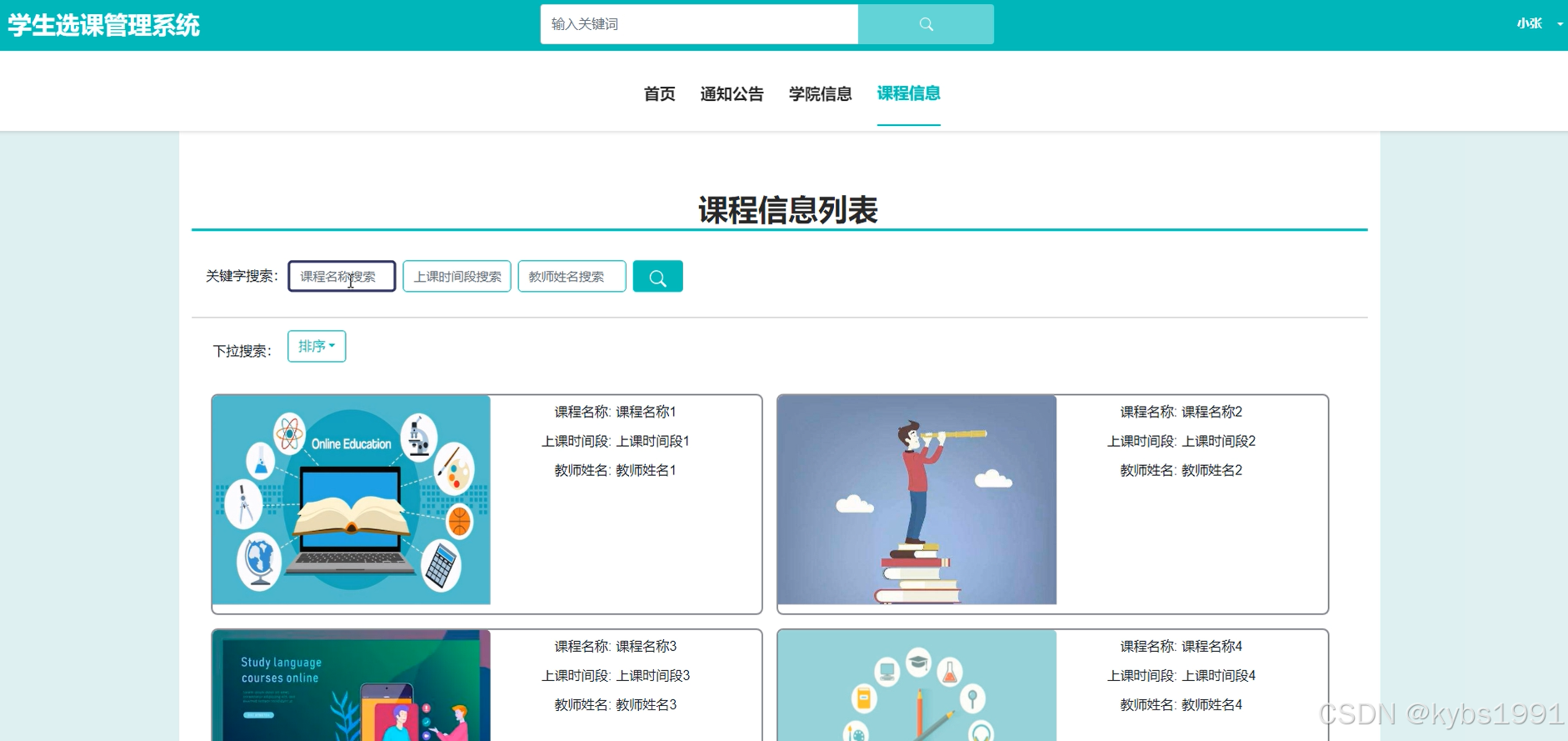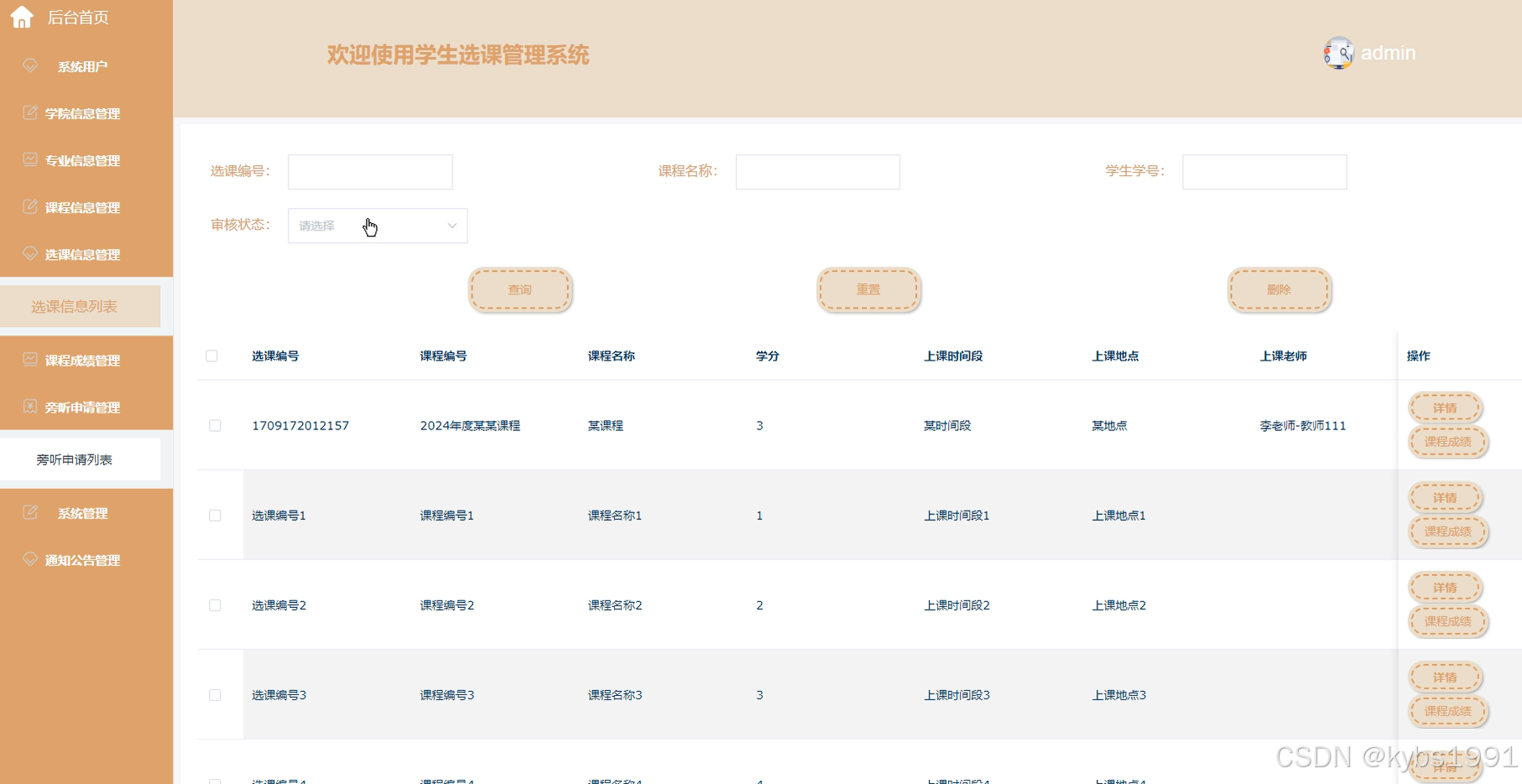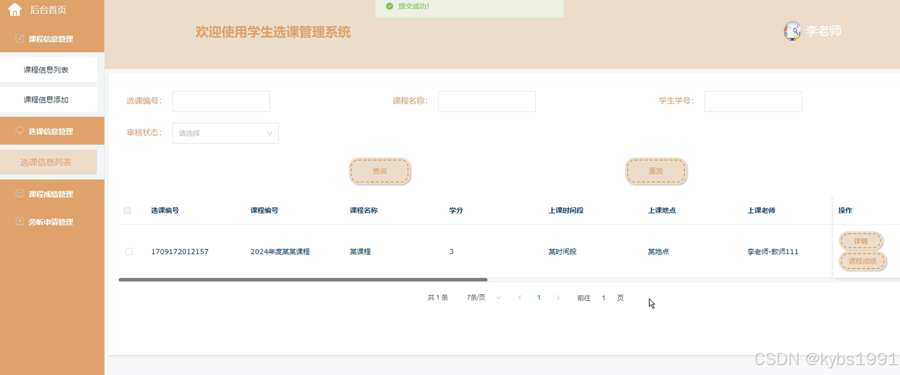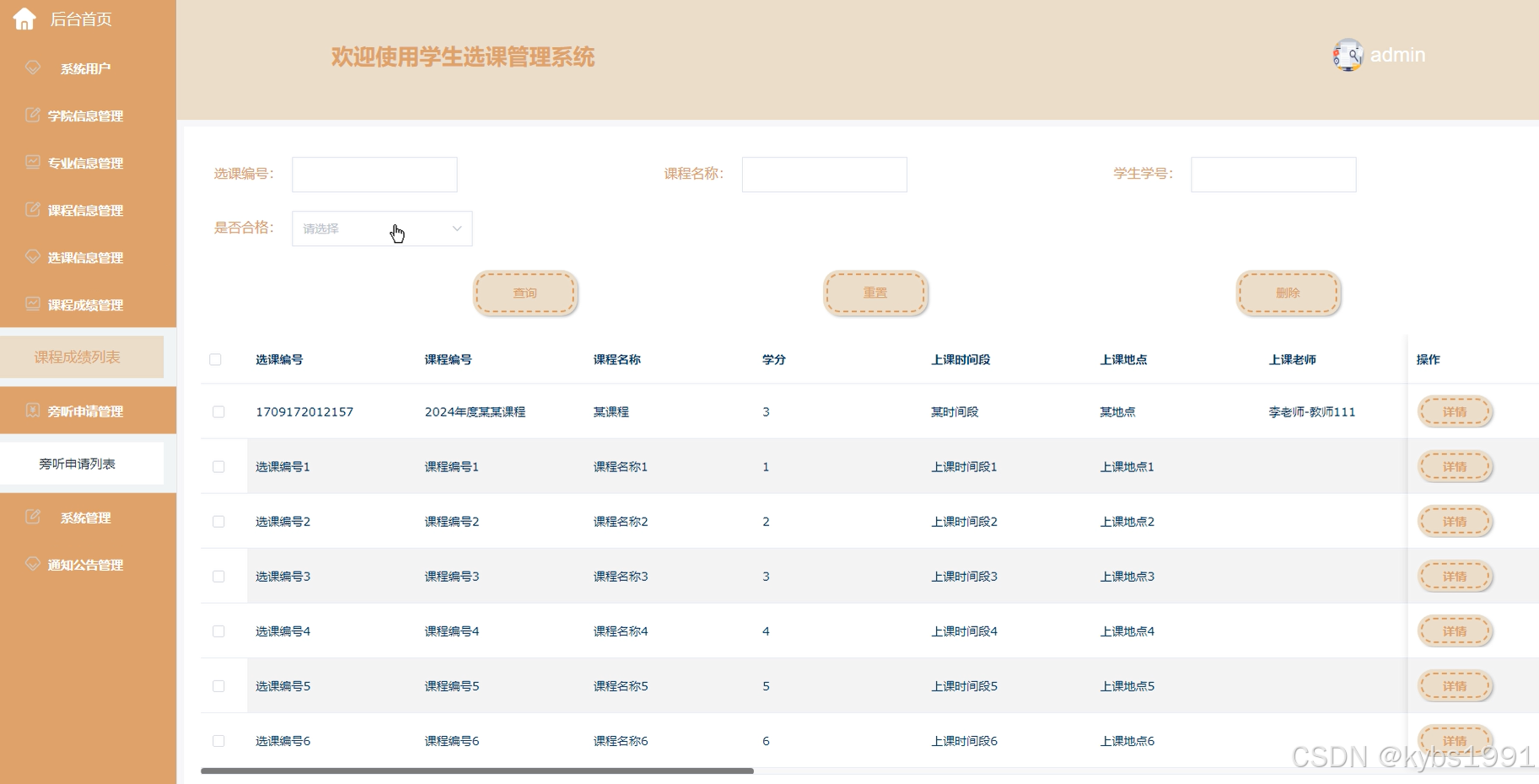 课程信息:用户可以通过关键字、下拉搜索查询课程信息。可以查看课程信息的课程名称、上课时间段、教师姓名等的详细内容,并进行选课、旁听等操作,如下图所示。