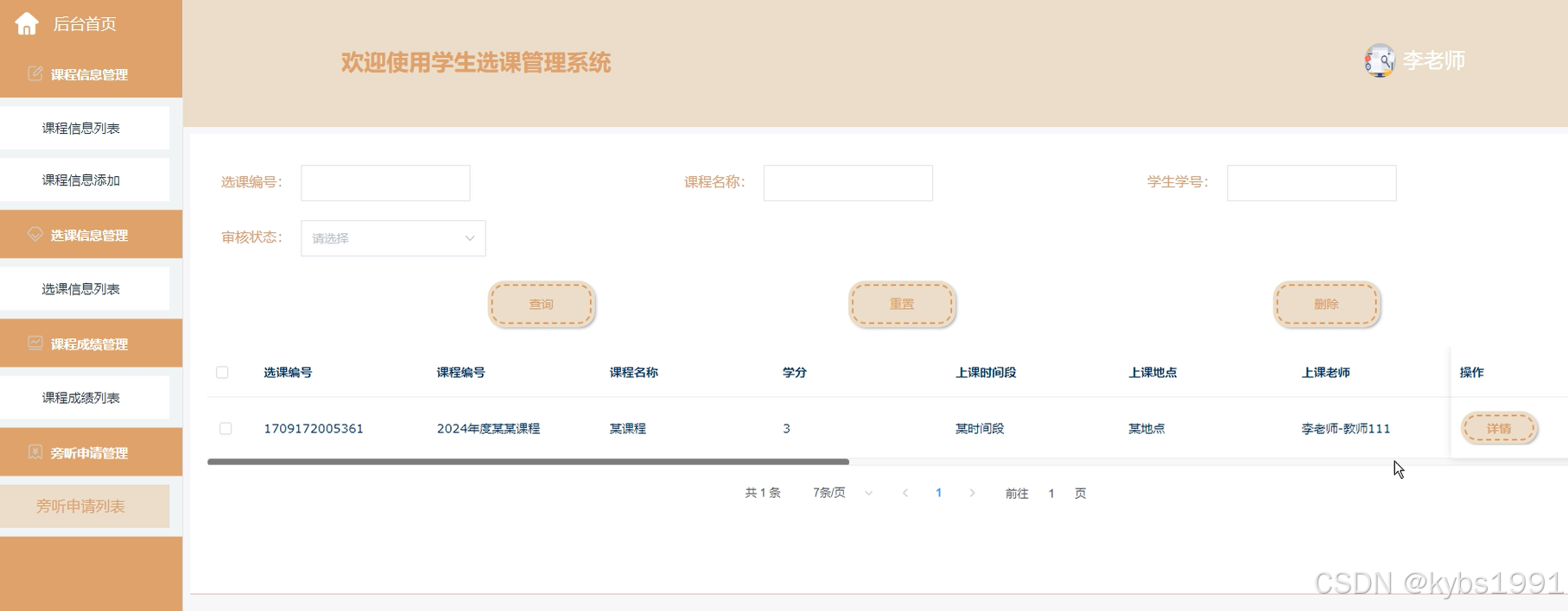 课程信息管理:可以查看课程编号、封面、学分、上课时间段、上课地点等信息,可以进行查询、删除等操作,如下图所示。