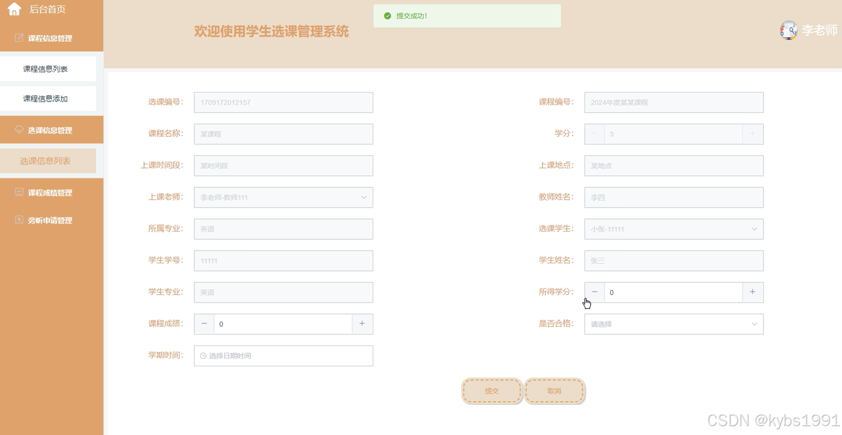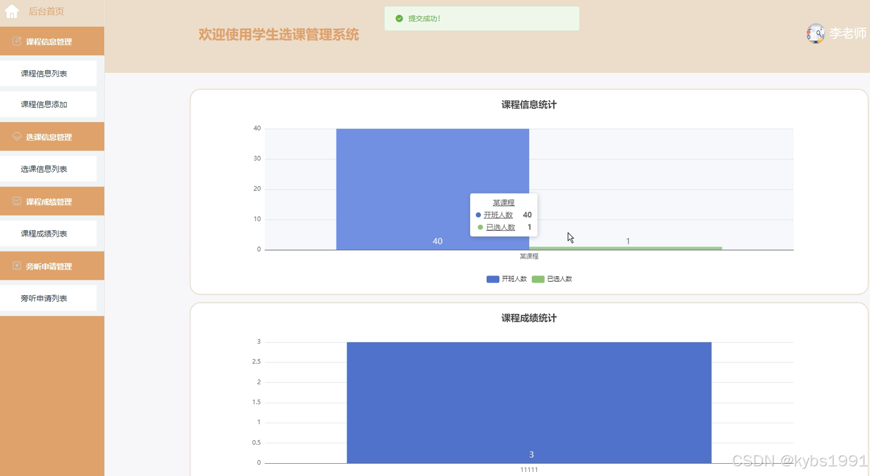 教师用户进入系统后台可以查看:后台首页、课程信息管理、选课信息管理、课程成绩管理、旁听申请管理等功能模块,还可进行相应的操作,如下图所示。